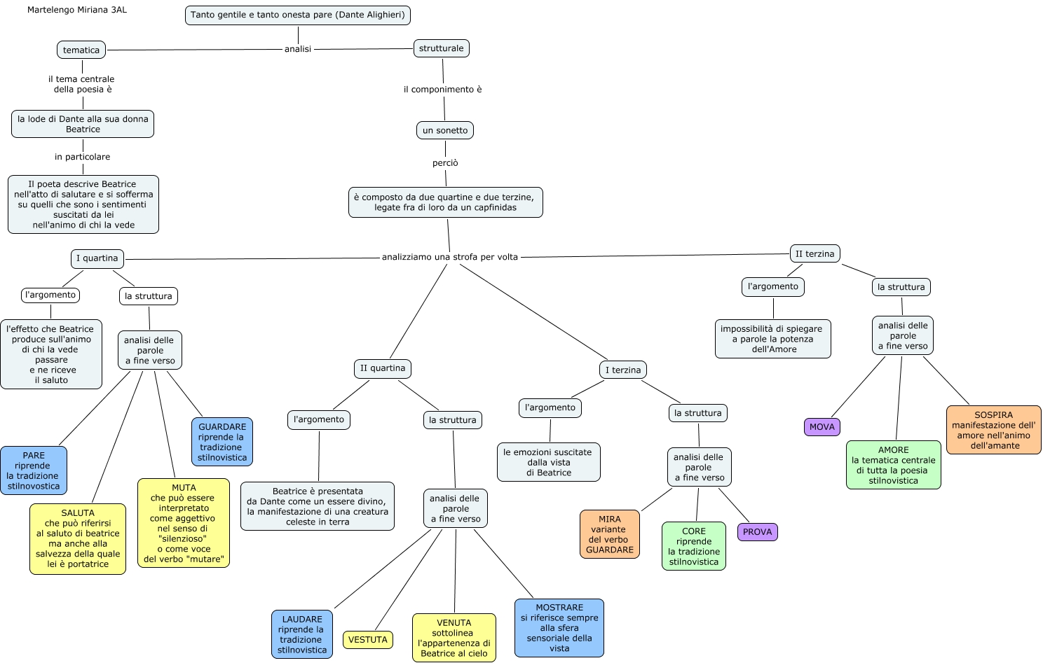Questa Cmap, creata con IHMC CmapTools, contiene informazioni relative a: Martelengo Miriana-Dante-Tanto gentile e tanto onesta pare, tematica il tema centrale della poesia è la lode di Dante alla sua donna Beatrice, I terzina l'argomento, II quartina l'argomento, analisi delle parole a fine verso LAUDARE riprende la tradizione stilnovistica, II terzina la struttura, analisi delle parole a fine verso MOVA, analisi delle parole a fine verso VESTUTA, analisi delle parole a fine verso SALUTA che può riferirsi al saluto di beatrice ma anche alla salvezza della quale lei è portatrice, l'argomento Beatrice è presentata da Dante come un essere divino, la manifestazione di una creatura celeste in terra, analisi delle parole a fine verso PROVA, I quartina l'argomento l'effetto che Beatrice produce sull'animo di chi la vede passare e ne riceve il saluto, analisi delle parole a fine verso AMORE la tematica centrale di tutta la poesia stilnovistica, analisi delle parole a fine verso MUTA che può essere interpretato come aggettivo nel senso di "silenzioso" o come voce del verbo "mutare", I quartina la struttura, analisi delle parole a fine verso MIRA variante del verbo GUARDARE, la lode di Dante alla sua donna Beatrice in particolare Il poeta descrive Beatrice nell'atto di salutare e si sofferma su quelli che sono i sentimenti suscitati da lei nell'animo di chi la vede, analisi delle parole a fine verso PARE riprende la tradizione stilnovostica, l'argomento impossibilità di spiegare a parole la potenza dell'Amore, analisi delle parole a fine verso MOSTRARE si riferisce sempre alla sfera sensoriale della vista, è composto da due quartine e due terzine, legate fra di loro da un capfinidas analizziamo una strofa per volta II quartina