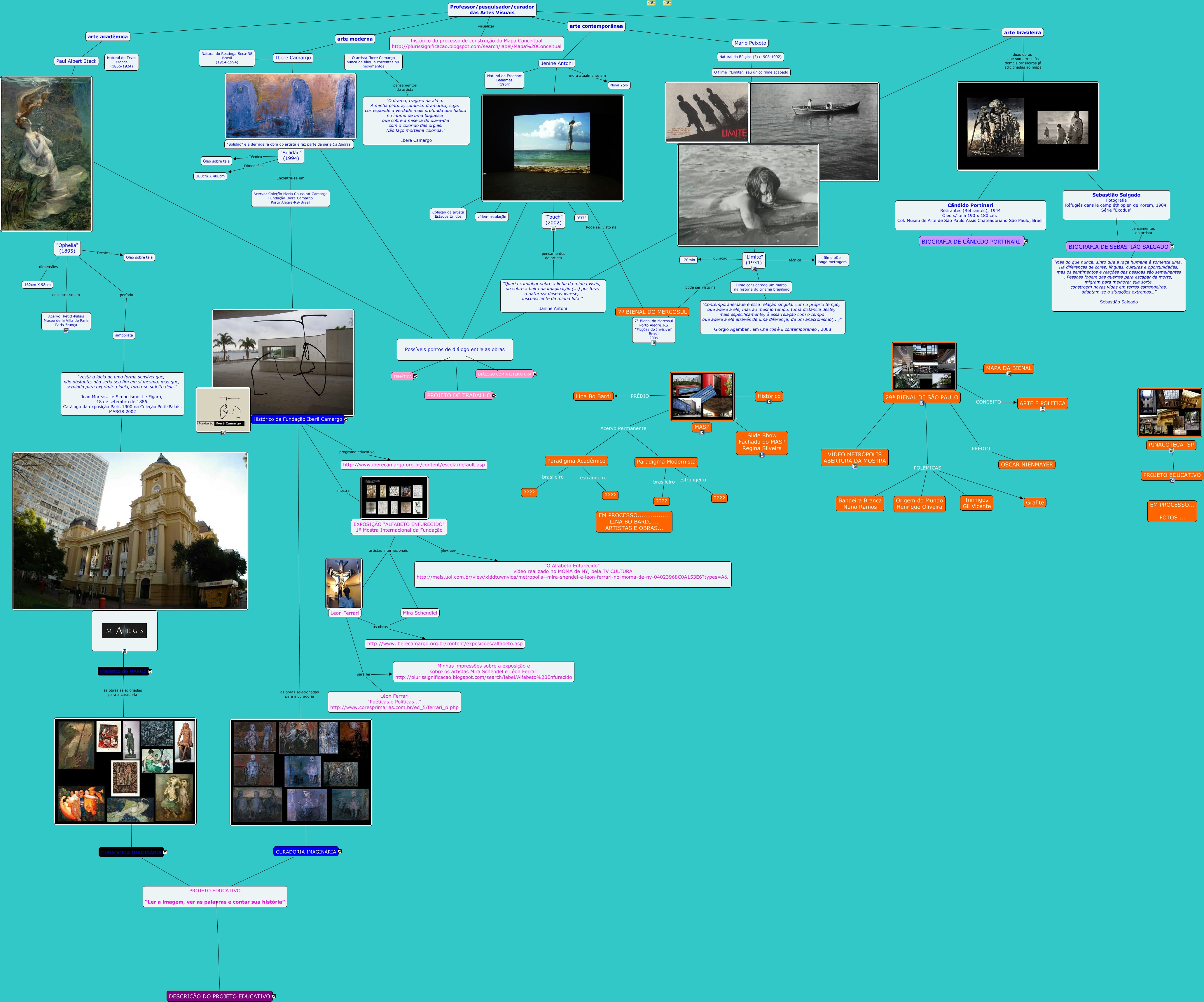 Esse mapa conceitual, produzido no IHMC CmapTools, tem a informação relacionada a: soniamaris_prof_pesq_curador_02_ATUALIZADO, Sebastião Salgado Fotografia Réfugiés dans le camp éthiopien de Korem, 1984. Série "Exodus" pensamentos do artista “Mas do que nunca, sinto que a raça humana é somente uma. Há diferenças de cores, línguas, culturas e oportunidades, mas os sentimentos e reações das pessoas são semelhantes . Pessoas fogem das guerras para escapar da morte, migram para melhorar sua sorte, constroem novas vidas em terras estrangeiras, adaptam-se a situações extremas…” Sebastião Salgado, "Solidão" (1994) Encontra-se em Acervo: Coleção Maria Coussirat Camargo Fundação Ibere Camargo Porto Alegre-RS-Brasil, ????, "Ophelia" (1895) dimensões 162cm X 98cm, Mira Schendlel as obras http://www.iberecamargo.org.br/content/exposicoes/alfabeto.asp, ???? Possíveis pontos de diálogo entre as obras, O filme "Limite", seu único filme acabado ????, "Vestir a ideia de uma forma sensível que, não obstante, não seria seu fim em si mesmo, mas que, servindo para exprimir a ideia, torna-se sujeito dela." Jean Moréas. Le Simbolisme. Le Figaro, 18 de setembro de 1886. Catálogo da exposição Paris 1900 na Coleção Petit-Palais. MARGS 2002 ????, EXPOSIÇÃO "ALFABETO ENFURECIDO" 1ª Mostra Internacional da Fundação artistas internacionais Mira Schendlel, Leon Ferrari para ler Minhas impressões sobre a exposição e sobre os artistas Mira Schendel e Léon Ferrari http://plurissignificacao.blogspot.com/search/label/Alfabeto%20Enfurecido, EXPOSIÇÃO "ALFABETO ENFURECIDO" 1ª Mostra Internacional da Fundação para ver "O Alfabeto Enfurecido" vídeo realizado no MOMA de NY, pela TV CULTURA http://mais.uol.com.br/view/xiddtuwnvlqs/metropolis--mira-shendel-e-leon-ferrari-no-moma-de-ny-04023968C0A153E6?types=A&, O artista Ibere Camargo nunca de filiou a correntes ou movimentos pensamentos do artista "O drama, trago-o na alma. A minha pintura, sombria, dramática, suja, corresponde a verdade mais profunda que habita no íntimo de uma buguesia que cobre a miséria do dia-a-dia com o colorido das orgias. Não faço mortalha colorida." Ibere Camargo, Leon Ferrari as obras http://www.iberecamargo.org.br/content/exposicoes/alfabeto.asp, "Touch" (2002) pensamentos da artista "Queria caminhar sobre a linha da minha visão, ou sobre a beira da imaginação (...) por fora, a natureza desenvolve-se, insconsciente da minha luta." Janine Antoni, CONCEITO ARTE E POLÍTICA, POLÊMICAS Origem do Mundo Henrique Oliveira, ???? "Limite" (1931), EXPOSIÇÃO "ALFABETO ENFURECIDO" 1ª Mostra Internacional da Fundação artistas internacionais Leon Ferrari, Possíveis pontos de diálogo entre as obras ???? PROJETO DE TRABALHO, Professor/pesquisador/curador das Artes Visuais ???? arte contemporânea