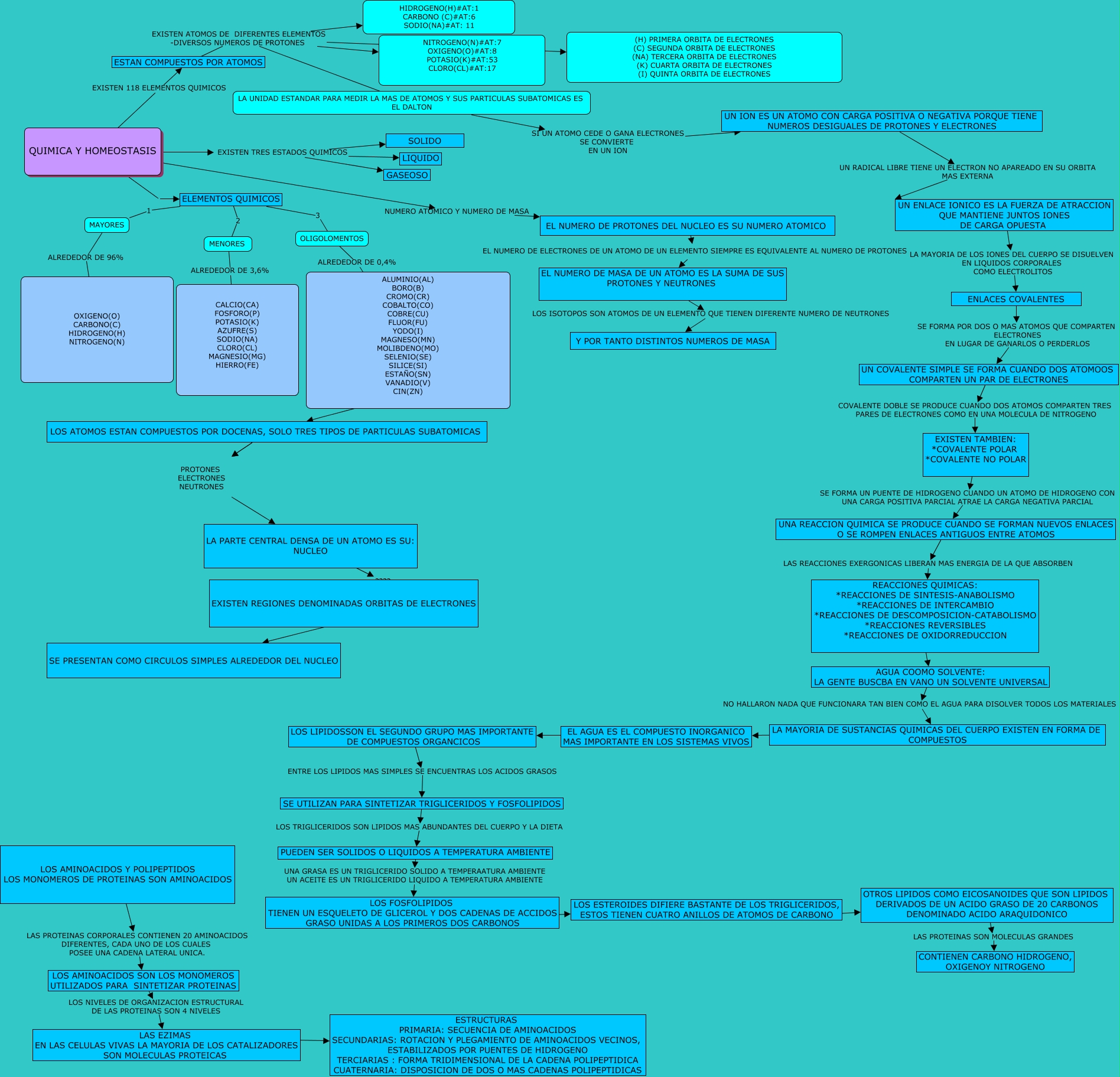 Este Cmap, tiene información relacionada con: mapasconceptuales_albagarciarovello, LA MAYORIA DE SUSTANCIAS QUIMICAS DEL CUERPO EXISTEN EN FORMA DE COMPUESTOS ???? EL AGUA ES EL COMPUESTO INORGANICO MAS IMPORTANTE EN LOS SISTEMAS VIVOS, UN ENLACE IONICO ES LA FUERZA DE ATRACCION QUE MANTIENE JUNTOS IONES DE CARGA OPUESTA LA MAYORIA DE LOS IONES DEL CUERPO SE DISUELVEN EN LIQUIDOS CORPORALES COMO ELECTROLITOS ENLACES COVALENTES, ELEMENTOS QUIMICOS 3 OLIGOLOMENTOS, EL NUMERO DE MASA DE UN ATOMO ES LA SUMA DE SUS PROTONES Y NEUTRONES LOS ISOTOPOS SON ATOMOS DE UN ELEMENTO QUE TIENEN DIFERENTE NUMERO DE NEUTRONES Y POR TANTO DISTINTOS NUMEROS DE MASA, EL AGUA ES EL COMPUESTO INORGANICO MAS IMPORTANTE EN LOS SISTEMAS VIVOS ???? LOS LIPIDOSSON EL SEGUNDO GRUPO MAS IMPORTANTE DE COMPUESTOS ORGANCICOS, PUEDEN SER SOLIDOS O LIQUIDOS A TEMPERATURA AMBIENTE UNA GRASA ES UN TRIGLICERIDO SOLIDO A TEMPERAATURA AMBIENTE UN ACEITE ES UN TRIGLICERIDO LIQUIDO A TEMPERATURA AMBIENTE LOS FOSFOLIPIDOS TIENEN UN ESQUELETO DE GLICEROL Y DOS CADENAS DE ACCIDOS GRASO UNIDAS A LOS PRIMEROS DOS CARBONOS, LOS ESTEROIDES DIFIERE BASTANTE DE LOS TRIGLICERIDOS, ESTOS TIENEN CUATRO ANILLOS DE ATOMOS DE CARBONO ???? OTROS LIPIDOS COMO EICOSANOIDES QUE SON LIPIDOS DERIVADOS DE UN ACIDO GRASO DE 20 CARBONOS DENOMINADO ACIDO ARAQUIDONICO, LOS LIPIDOSSON EL SEGUNDO GRUPO MAS IMPORTANTE DE COMPUESTOS ORGANCICOS ENTRE LOS LIPIDOS MAS SIMPLES SE ENCUENTRAS LOS ACIDOS GRASOS SE UTILIZAN PARA SINTETIZAR TRIGLICERIDOS Y FOSFOLIPIDOS, QUIMICA Y HOMEOSTASIS EXISTEN TRES ESTADOS QUIMICOS SOLIDO, QUIMICA Y HOMEOSTASIS EXISTEN TRES ESTADOS QUIMICOS GASEOSO, SE UTILIZAN PARA SINTETIZAR TRIGLICERIDOS Y FOSFOLIPIDOS LOS TRIGLICERIDOS SON LIPIDOS MAS ABUNDANTES DEL CUERPO Y LA DIETA PUEDEN SER SOLIDOS O LIQUIDOS A TEMPERATURA AMBIENTE, UN ION ES UN ATOMO CON CARGA POSITIVA O NEGATIVA PORQUE TIENE NUMEROS DESIGUALES DE PROTONES Y ELECTRONES UN RADICAL LIBRE TIENE UN ELECTRON NO APAREADO EN SU ORBITA MAS EXTERNA UN ENLACE IONICO ES LA FUERZA DE ATRACCION QUE MANTIENE JUNTOS IONES DE CARGA OPUESTA, ALUMINIO(AL) BORO(B) CROMO(CR) COBALTO(CO) COBRE(CU) FLUOR(FU) YODO(I) MAGNESO(MN) MOLIBDENO(MO) SELENIO(SE) SILICE(SI) ESTAÑO(SN) VANADIO(V) CIN(ZN) ???? LOS ATOMOS ESTAN COMPUESTOS POR DOCENAS, SOLO TRES TIPOS DE PARTICULAS SUBATOMICAS, LOS ATOMOS ESTAN COMPUESTOS POR DOCENAS, SOLO TRES TIPOS DE PARTICULAS SUBATOMICAS PROTONES ELECTRONES NEUTRONES LA PARTE CENTRAL DENSA DE UN ATOMO ES SU: NUCLEO, OLIGOLOMENTOS ALREDEDOR DE 0,4% ALUMINIO(AL) BORO(B) CROMO(CR) COBALTO(CO) COBRE(CU) FLUOR(FU) YODO(I) MAGNESO(MN) MOLIBDENO(MO) SELENIO(SE) SILICE(SI) ESTAÑO(SN) VANADIO(V) CIN(ZN), ESTAN COMPUESTOS POR ATOMOS EXISTEN ATOMOS DE DIFERENTES ELEMENTOS -DIVERSOS NUMEROS DE PROTONES (H) PRIMERA ORBITA DE ELECTRONES (C) SEGUNDA ORBITA DE ELECTRONES (NA) TERCERA ORBITA DE ELECTRONES (K) CUARTA ORBITA DE ELECTRONES (I) QUINTA ORBITA DE ELECTRONES, LOS FOSFOLIPIDOS TIENEN UN ESQUELETO DE GLICEROL Y DOS CADENAS DE ACCIDOS GRASO UNIDAS A LOS PRIMEROS DOS CARBONOS ???? LOS ESTEROIDES DIFIERE BASTANTE DE LOS TRIGLICERIDOS, ESTOS TIENEN CUATRO ANILLOS DE ATOMOS DE CARBONO, QUIMICA Y HOMEOSTASIS ELEMENTOS QUIMICOS, REACCIONES QUIMICAS: *REACCIONES DE SINTESIS-ANABOLISMO *REACCIONES DE INTERCAMBIO *REACCIONES DE DESCOMPOSICION-CATABOLISMO *REACCIONES REVERSIBLES *REACCIONES DE OXIDORREDUCCION ???? AGUA COOMO SOLVENTE: LA GENTE BUSCBA EN VANO UN SOLVENTE UNIVERSAL, ESTAN COMPUESTOS POR ATOMOS EXISTEN ATOMOS DE DIFERENTES ELEMENTOS -DIVERSOS NUMEROS DE PROTONES LA UNIDAD ESTANDAR PARA MEDIR LA MAS DE ATOMOS Y SUS PARTICULAS SUBATOMICAS ES EL DALTON