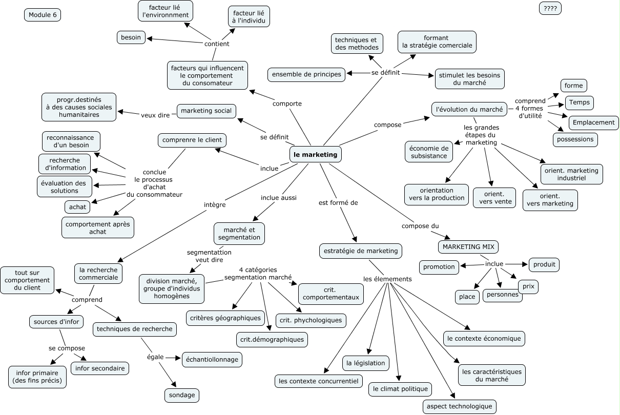 Cette carte de concepts créée avec IHMC CmapTools traite de: module 6, marché et segmentation segmentattion veut dire division marché, groupe d'individus homogènes, l'évolution du marché comprend 4 formes d'utilité forme, estratégie de marketing les élemements la législation, l'évolution du marché comprend 4 formes d'utilité Temps, l'évolution du marché comprend 4 formes d'utilité possessions, MARKETING MIX inclue personnes, division marché, groupe d'individus homogènes 4 catégories segmentation marché crit.démographiques, marketing social veux dire progr.destinés à des causes sociales humanitaires, le marketing est formé de estratégie de marketing, comprenre le client conclue le processus d'achat du consommateur achat, comprenre le client conclue le processus d'achat du consommateur comportement après achat, le marketing compose du MARKETING MIX, le marketing se définit ensemble de principes, estratégie de marketing les élemements les caractéristiques du marché, estratégie de marketing les élemements les contexte concurrentiel, le marketing se définit marketing social, MARKETING MIX inclue prix, MARKETING MIX inclue produit, sources d'infor se compose infor secondaire, la recherche commerciale comprend sources d'infor