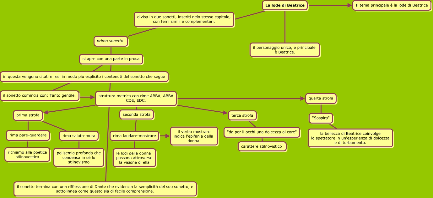 Questa Cmap, creata con IHMC CmapTools, contiene informazioni relative a: Tanto gentile e tanto onesta pare, seconda strofa rima laudare-mostrare, La lode di Beatrice Il tema principale è la lode di Beatrice, La lode di Beatrice divisa in due sonetti, inseriti nelo stesso capitolo, con temi simili e complementari., rima laudare-mostrare le lodi della donna passano attraverso la visione di ella, rima pare-guardare richiamo alla poetica stilnovostica, prima strofa rima pare-guardare, quarta strofa "Sospira", in questa vengono citati e resi in modo più esplicito i contenuti del sonetto che segue il sonetto comincia con: Tanto gentile., struttura metrica con rime ABBA, ABBA CDE, EDC. prima strofa, struttura metrica con rime ABBA, ABBA CDE, EDC. terza strofa, si apre con una parte in prosa il sonetto termina con una rifflessione di Dante che evidenzia la semplicità del suo sonetto, e sottolinnea come questo sia di facile comprensione., primo sonetto si apre con una parte in prosa, rima laudare-mostrare il verbo mostrare indica l'epifania della donna, struttura metrica con rime ABBA, ABBA CDE, EDC. quarta strofa, si apre con una parte in prosa in questa vengono citati e resi in modo più esplicito i contenuti del sonetto che segue, "da per li occhi una dolcezza al core" carattere stilnovistico, terza strofa "da per li occhi una dolcezza al core", La lode di Beatrice il personaggio unico, e principale è Beatrice., "Sospira" la bellezza di Beatrice coinvolge lo spettatore in un'esperienza di dolcezza e di turbamento., divisa in due sonetti, inseriti nelo stesso capitolo, con temi simili e complementari. primo sonetto