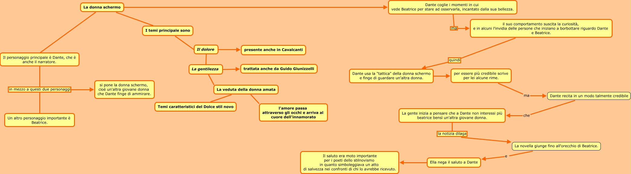 Questa Cmap, creata con IHMC CmapTools, contiene informazioni relative a: La donna schermo - Luca Pasta, La donna schermo Dante coglie i momenti in cui vede Beatrice per stare ad osservarla, incantato dalla sua bellezza., La gente inizia a pensare che a Dante non interessi più beatrice bensì un'altra giovane donna. la notizia dilaga La novella giunge fino all'orecchio di Beatrice., La novella giunge fino all'orecchio di Beatrice. e Ella nega il saluto a Dante, Il personaggio principale è Dante, che è anche il narratore. in mezzo a questi due personaggi Un altro personaggio importante è Beatrice., Dante recita in un modo talmente credibile che La gente inizia a pensare che a Dante non interessi più beatrice bensì un'altra giovane donna., I temi principale sono Il dolore, La donna schermo I temi principale sono, La veduta della donna amata l'amore passa attraverso gli occhi e arriva al cuore dell'innamorato, La gentilezza trattata anche da Guido Giunizzelli, Il dolore presente anche in Cavalcanti, Il personaggio principale è Dante, che è anche il narratore. in mezzo a questi due personaggi si pone la donna schermo, cioè un'altra giovane donna che Dante finge di ammirare., La gentilezza La veduta della donna amata, Il dolore La gentilezza, per essere più credibile scrive per lei alcune rime. ma Dante recita in un modo talmente credibile, Dante coglie i momenti in cui vede Beatrice per stare ad osservarla, incantato dalla sua bellezza. ma il suo comportamento suscita la curiosità, e in alcuni l'invidia delle persone che iniziano a borbottare riguardo Dante e Beatrice., il suo comportamento suscita la curiosità, e in alcuni l'invidia delle persone che iniziano a borbottare riguardo Dante e Beatrice. quindi Dante usa la "tattica" della donna schermo e finge di guardare un'altra donna., La donna schermo Il personaggio principale è Dante, che è anche il narratore., Dante usa la "tattica" della donna schermo e finge di guardare un'altra donna. ???? per essere più credibile scrive per lei alcune rime., La veduta della donna amata Temi caratteristici del Dolce stil novo, Ella nega il saluto a Dante Il saluto era moto importante per i poeti dello stilnovismo in quanto simboleggiava un atto di salvezza nei confronti di chi lo avrebbe ricevuto.