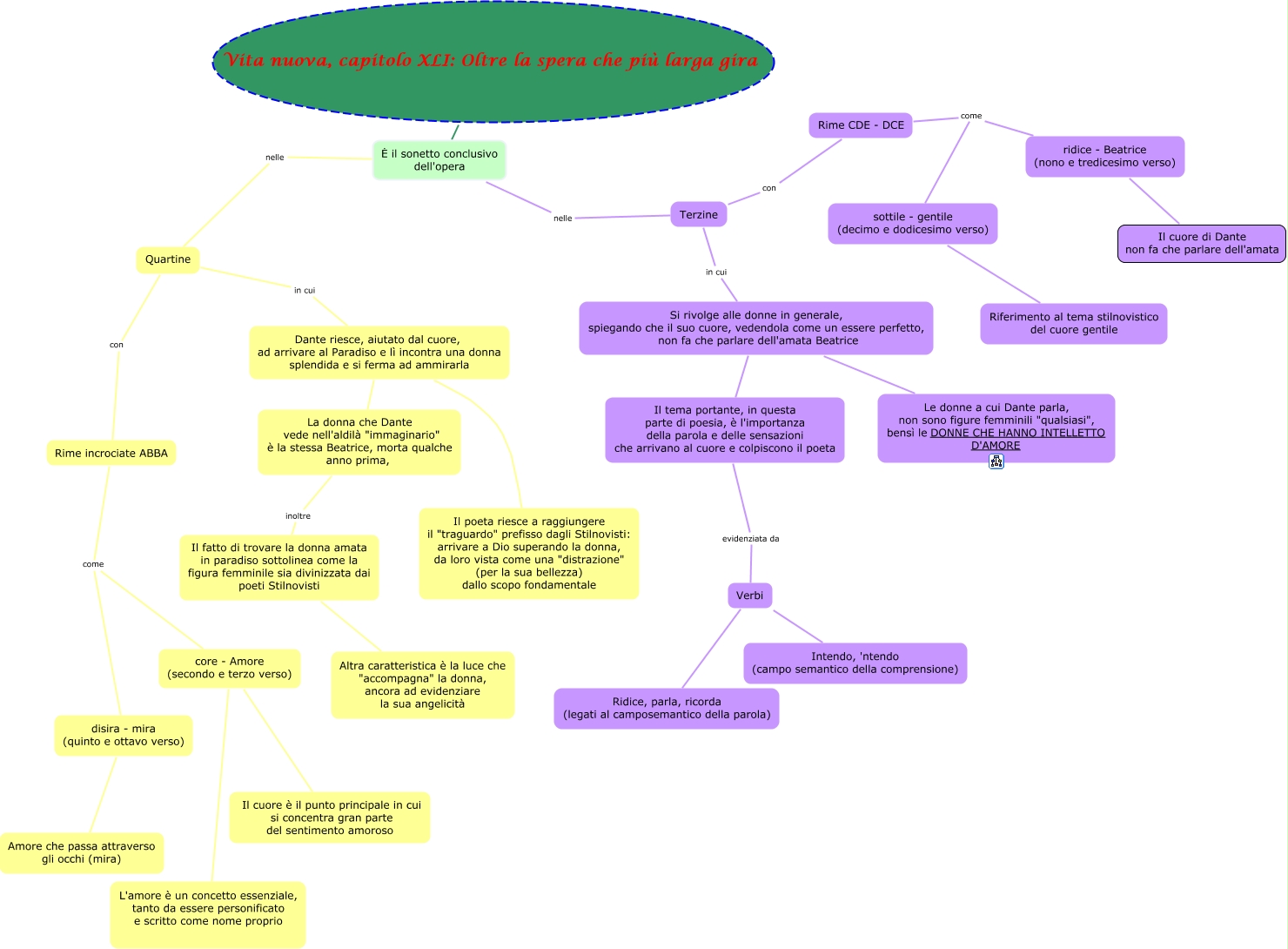 Questa Cmap, creata con IHMC CmapTools, contiene informazioni relative a: Oltre la spera - Mirko Fustinoni, disira - mira (quinto e ottavo verso) Amore che passa attraverso gli occhi (mira), Vita nuova, capitolo XLI: Oltre la spera che più larga gira Ė il sonetto conclusivo dell'opera, Il fatto di trovare la donna amata in paradiso sottolinea come la figura femminile sia divinizzata dai poeti Stilnovisti Altra caratteristica è la luce che "accompagna" la donna, ancora ad evidenziare la sua angelicità, Si rivolge alle donne in generale, spiegando che il suo cuore, vedendola come un essere perfetto, non fa che parlare dell'amata Beatrice Il tema portante, in questa parte di poesia, è l'importanza della parola e delle sensazioni che arrivano al cuore e colpiscono il poeta, Il tema portante, in questa parte di poesia, è l'importanza della parola e delle sensazioni che arrivano al cuore e colpiscono il poeta evidenziata da Verbi, Dante riesce, aiutato dal cuore, ad arrivare al Paradiso e lì incontra una donna splendida e si ferma ad ammirarla La donna che Dante vede nell'aldilà "immaginario" è la stessa Beatrice, morta qualche anno prima,, sottile - gentile (decimo e dodicesimo verso) Riferimento al tema stilnovistico del cuore gentile, Si rivolge alle donne in generale, spiegando che il suo cuore, vedendola come un essere perfetto, non fa che parlare dell'amata Beatrice Le donne a cui Dante parla, non sono figure femminili "qualsiasi", bensì le DONNE CHE HANNO INTELLETTO D'AMORE, Rime CDE - DCE come sottile - gentile (decimo e dodicesimo verso), Dante riesce, aiutato dal cuore, ad arrivare al Paradiso e lì incontra una donna splendida e si ferma ad ammirarla Il poeta riesce a raggiungere il "traguardo" prefisso dagli Stilnovisti: arrivare a Dio superando la donna, da loro vista come una "distrazione" (per la sua bellezza) dallo scopo fondamentale, Rime incrociate ABBA come disira - mira (quinto e ottavo verso), core - Amore (secondo e terzo verso) Il cuore è il punto principale in cui si concentra gran parte del sentimento amoroso, Verbi Ridice, parla, ricorda (legati al camposemantico della parola), Rime incrociate ABBA come core - Amore (secondo e terzo verso), Terzine con Rime CDE - DCE, La donna che Dante vede nell'aldilà "immaginario" è la stessa Beatrice, morta qualche anno prima, inoltre Il fatto di trovare la donna amata in paradiso sottolinea come la figura femminile sia divinizzata dai poeti Stilnovisti, Terzine in cui Si rivolge alle donne in generale, spiegando che il suo cuore, vedendola come un essere perfetto, non fa che parlare dell'amata Beatrice, Quartine con Rime incrociate ABBA, Rime CDE - DCE come ridice - Beatrice (nono e tredicesimo verso), Quartine in cui Dante riesce, aiutato dal cuore, ad arrivare al Paradiso e lì incontra una donna splendida e si ferma ad ammirarla