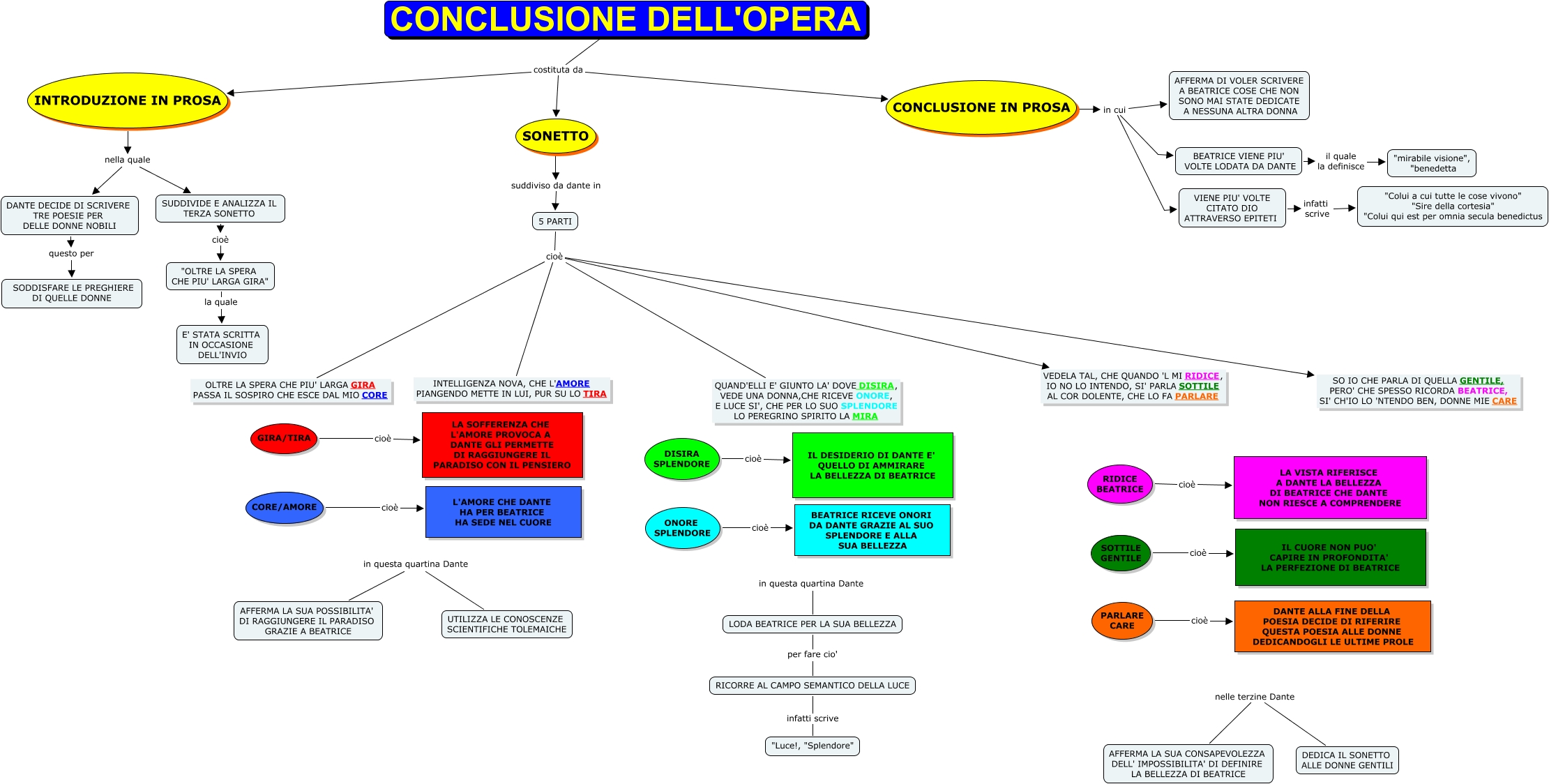 Questa Cmap, creata con IHMC CmapTools, contiene informazioni relative a: Conclusione dell'opera Gaboardi Diego, CONCLUSIONE IN PROSA in cui AFFERMA DI VOLER SCRIVERE A BEATRICE COSE CHE NON SONO MAI STATE DEDICATE A NESSUNA ALTRA DONNA, CONCLUSIONE DELL'OPERA costituta da SONETTO, CONCLUSIONE IN PROSA in cui VIENE PIU' VOLTE CITATO DIO ATTRAVERSO EPITETI, 5 PARTI cioè INTELLIGENZA NOVA, CHE L'AMORE PIANGENDO METTE IN LUI, PUR SU LO TIRA, ONORE SPLENDORE cioè BEATRICE RICEVE ONORI DA DANTE GRAZIE AL SUO SPLENDORE E ALLA SUA BELLEZZA, VIENE PIU' VOLTE CITATO DIO ATTRAVERSO EPITETI infatti scrive "Colui a cui tutte le cose vivono" "Sire della cortesia" "Colui qui est per omnia secula benedictus, OLTRE LA SPERA CHE PIU' LARGA GIRA PASSA IL SOSPIRO CHE ESCE DAL MIO CORE in questa quartina Dante UTILIZZA LE CONOSCENZE SCIENTIFICHE TOLEMAICHE, VEDELA TAL, CHE QUANDO 'L MI RIDICE, IO NO LO INTENDO, SI' PARLA SOTTILE AL COR DOLENTE, CHE LO FA PARLARE nelle terzine Dante AFFERMA LA SUA CONSAPEVOLEZZA DELL' IMPOSSIBILITA' DI DEFINIRE LA BELLEZZA DI BEATRICE, "OLTRE LA SPERA CHE PIU' LARGA GIRA" la quale E' STATA SCRITTA IN OCCASIONE DELL'INVIO, SOTTILE GENTILE cioè IL CUORE NON PUO' CAPIRE IN PROFONDITA' LA PERFEZIONE DI BEATRICE, INTRODUZIONE IN PROSA nella quale DANTE DECIDE DI SCRIVERE TRE POESIE PER DELLE DONNE NOBILI, 5 PARTI cioè VEDELA TAL, CHE QUANDO 'L MI RIDICE, IO NO LO INTENDO, SI' PARLA SOTTILE AL COR DOLENTE, CHE LO FA PARLARE, OLTRE LA SPERA CHE PIU' LARGA GIRA PASSA IL SOSPIRO CHE ESCE DAL MIO CORE in questa quartina Dante AFFERMA LA SUA POSSIBILITA' DI RAGGIUNGERE IL PARADISO GRAZIE A BEATRICE, DISIRA SPLENDORE cioè IL DESIDERIO DI DANTE E' QUELLO DI AMMIRARE LA BELLEZZA DI BEATRICE, RIDICE BEATRICE cioè LA VISTA RIFERISCE A DANTE LA BELLEZZA DI BEATRICE CHE DANTE NON RIESCE A COMPRENDERE, 5 PARTI cioè QUAND'ELLI E' GIUNTO LA' DOVE DISIRA, VEDE UNA DONNA,CHE RICEVE ONORE, E LUCE SI', CHE PER LO SUO SPLENDORE LO PEREGRINO SPIRITO LA MIRA, CONCLUSIONE DELL'OPERA costituta da CONCLUSIONE IN PROSA, LODA BEATRICE PER LA SUA BELLEZZA per fare cio' RICORRE AL CAMPO SEMANTICO DELLA LUCE, DANTE DECIDE DI SCRIVERE TRE POESIE PER DELLE DONNE NOBILI questo per SODDISFARE LE PREGHIERE DI QUELLE DONNE, CONCLUSIONE IN PROSA in cui BEATRICE VIENE PIU' VOLTE LODATA DA DANTE