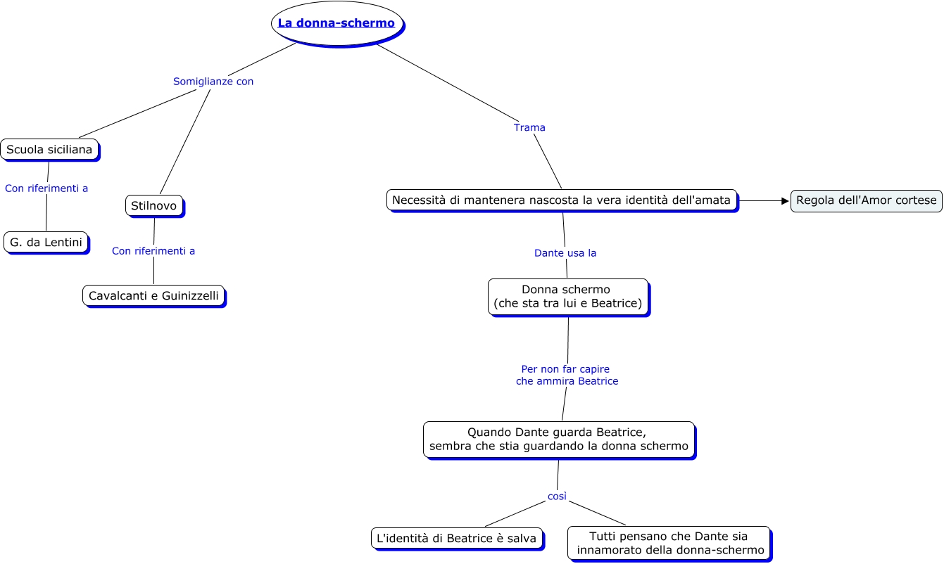 Questa Cmap, creata con IHMC CmapTools, contiene informazioni relative a: La donna-schermo-Midali, Stilnovo Con riferimenti a Cavalcanti e Guinizzelli, La donna-schermo Somiglianze con Scuola siciliana, Necessità di mantenera nascosta la vera identità dell'amata Dante usa la Donna schermo (che sta tra lui e Beatrice), La donna-schermo Somiglianze con Stilnovo, La donna-schermo Trama Necessità di mantenera nascosta la vera identità dell'amata, Quando Dante guarda Beatrice, sembra che stia guardando la donna schermo così Tutti pensano che Dante sia innamorato della donna-schermo, Scuola siciliana Con riferimenti a G. da Lentini, Donna schermo (che sta tra lui e Beatrice) Per non far capire che ammira Beatrice Quando Dante guarda Beatrice, sembra che stia guardando la donna schermo, Necessità di mantenera nascosta la vera identità dell'amata ???? Regola dell'Amor cortese, Quando Dante guarda Beatrice, sembra che stia guardando la donna schermo così L'identità di Beatrice è salva
