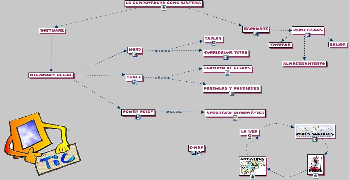 Este Cmap, tiene información relacionada con: TIC, EXCEL aplicaciones FÓRMULAS Y FUNCIONES, LA COMPUTADORA COMO SISTEMA ???? SOFTWARE, POWER POINT aplicaciones SEGURIDAD INFORMÁTICA, MICROSOFT OFFICE ???? POWER POINT, MICROSOFT OFFICE ???? EXCEL, PERIFÉRICOS ???? ENTRADA, SOFTWARE ???? MICROSOFT OFFICE, WORD aplicaciones TABLAS, LA WEB ???? REDES SOCIALES, WORD aplicaciones CURRICULUM VITAE, EXCEL aplicaciones FORMATO DE CELDAS, VIRUS ???? ANTIVIRUS, PERIFÉRICOS ???? ALMACENAMIENTO, HARDWARE ???? ????, ANTIVIRUS ???? LA WEB, MICROSOFT OFFICE ???? WORD, PERIFÉRICOS ???? SALIDA, REDES SOCIALES ? VIRUS, LA COMPUTADORA COMO SISTEMA ???? HARDWARE