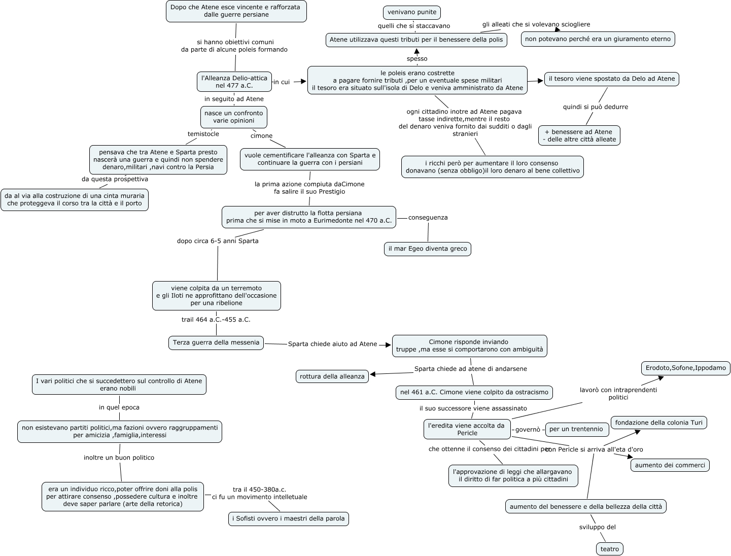 Questa Cmap, creata con IHMC CmapTools, contiene informazioni relative a: dal 478-al 460a.c. la politica di Atene oprandi, Dopo che Atene esce vincente e rafforzata dalle guerre persiane si hanno obiettivi comuni da parte di alcune poleis formando l'Alleanza Delio-attica nel 477 a.C., Cimone risponde inviando truppe ,ma esse si comportarono con ambiguità Sparta chiede ad atene di andarsene nel 461 a.C. Cimone viene colpito da ostracismo, le poleis erano costrette a pagare fornire tributi ,per un eventuale spese militari il tesoro era situato sull'isola di Delo e veniva amministrato da Atene ???? il tesoro viene spostato da Delo ad Atene, per aver distrutto la flotta persiana prima che si mise in moto a Eurimedonte nel 470 a.C. dopo circa 6-5 anni Sparta viene colpita da un terremoto e gli Iloti ne approfittano dell'occasione per una ribelione, Atene utilizzava questi tributi per il benessere della polis quelli che si staccavano venivano punite, non esistevano partiti politici,ma fazioni ovvero raggruppamenti per amicizia ,famiglia,interessi inoltre un buon politico era un individuo ricco,poter offrire doni alla polis per attirare consenso ,possedere cultura e inoltre deve saper parlare (arte della retorica), nel 461 a.C. Cimone viene colpito da ostracismo il suo successore viene assassinato l'eredita viene accolta da Pericle, le poleis erano costrette a pagare fornire tributi ,per un eventuale spese militari il tesoro era situato sull'isola di Delo e veniva amministrato da Atene ogni cittadino inotre ad Atene pagava tasse indirette,mentre il resto del denaro veniva fornito dai sudditi o dagli stranieri i ricchi però per aumentare il loro consenso donavano (senza obbligo)il loro denaro al bene collettivo, viene colpita da un terremoto e gli Iloti ne approfittano dell'occasione per una ribelione trail 464 a.C.-455 a.C. Terza guerra della messenia, aumento del benessere e della bellezza della città sviluppo del teatro, per aver distrutto la flotta persiana prima che si mise in moto a Eurimedonte nel 470 a.C. conseguenza il mar Egeo diventa greco, l'eredita viene accolta da Pericle lavorò con intraprendenti politici Erodoto,Sofone,Ippodamo, l'eredita viene accolta da Pericle con Pericle si arriva all'eta d'oro fondazione della colonia Turi, Cimone risponde inviando truppe ,ma esse si comportarono con ambiguità Sparta chiede ad atene di andarsene rottura della alleanza, nasce un confronto varie opinioni cimone vuole cementificare l'alleanza con Sparta e continuare la guerra con i persiani, l'Alleanza Delio-attica nel 477 a.C. in cui le poleis erano costrette a pagare fornire tributi ,per un eventuale spese militari il tesoro era situato sull'isola di Delo e veniva amministrato da Atene, l'eredita viene accolta da Pericle con Pericle si arriva all'eta d'oro aumento del benessere e della bellezza della città, le poleis erano costrette a pagare fornire tributi ,per un eventuale spese militari il tesoro era situato sull'isola di Delo e veniva amministrato da Atene spesso Atene utilizzava questi tributi per il benessere della polis, Terza guerra della messenia Sparta chiede aiuto ad Atene Cimone risponde inviando truppe ,ma esse si comportarono con ambiguità, pensava che tra Atene e Sparta presto nascerà una guerra e quindi non spendere denaro,militari ,navi contro la Persia da questa prospettiva da al via alla costruzione di una cinta muraria che proteggeva il corso tra la città e il porto