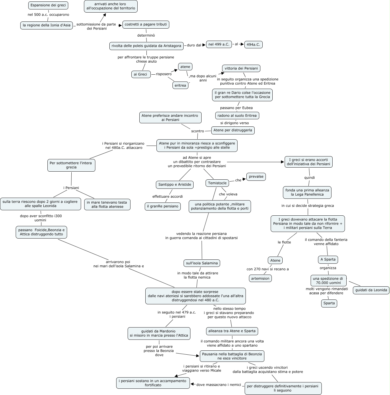 Questa Cmap, creata con IHMC CmapTools, contiene informazioni relative a: dal 500 al 478 a.c. le guerre persiane oprandi, la regione della Ionia d'Asia sottomissione da parte dei Persiani costretti a pagare tributi, Santippo e Aristide effettuare accordi il granRe persiano, il gran re Dario colse l'occasione per sottomettere tutta la Grecia passano per Eubea radono al suolo Eritrea, Atene per distruggerla scontro Atene pur in minoranza riesce a sconfiggere i Persiani da sola =prestigio alle stelle, ai Greci risposero atene, sulla terra riescono dopo 2 giorni a cogliere alle spalle Leonida dopo aver sconfitto i300 uomini passano Foicide,Beonzia e Attica distruggendo tutto, rivolta delle poleis guidata da Aristagora duro dal nel 499 a.C., una spedizione di 70.000 uomini molti vengono rimandati acasa per difendere Sparta, Temistocle vedendo la reazione persiana in guerra comanda ai cittadini di spostarsi sull'isola Salamina, per distruggere definitivamente i persiani li seguono dove massacrano i nemici i persiani sostano in un accampamento fortificato, Atene preferisce andare incontro ai Persiani scontro Atene pur in minoranza riesce a sconfiggere i Persiani da sola =prestigio alle stelle, ai Greci risposero eritrea, Atene pur in minoranza riesce a sconfiggere i Persiani da sola =prestigio alle stelle ad Atene si apre un dibattito per contrastare un prevedibile ritorno dei Persiani I greci si erano accorti dell'iniziativa dei Persiani, Atene pur in minoranza riesce a sconfiggere i Persiani da sola =prestigio alle stelle ad Atene si apre un dibattito per contrastare un prevedibile ritorno dei Persiani Temistocle, la regione della Ionia d'Asia sottomissione da parte dei Persiani arrivati anche loro all'occupazione del territorio, Per sottomettere l'intera grecia i Persiani in mare tenevano testa alla flotta ateniese, radono al suolo Eritrea si dirigono verso Atene per distruggerla, eritrea ,ma dopo alcuni anni vittoria dei Persiani, Per sottomettere l'intera grecia i Persiani sulla terra riescono dopo 2 giorni a cogliere alle spalle Leonida, I greci dovevano attacare la flotta Persiana in modo tale da non rifornire + i militari persiani sulla Terra le flotte Atene