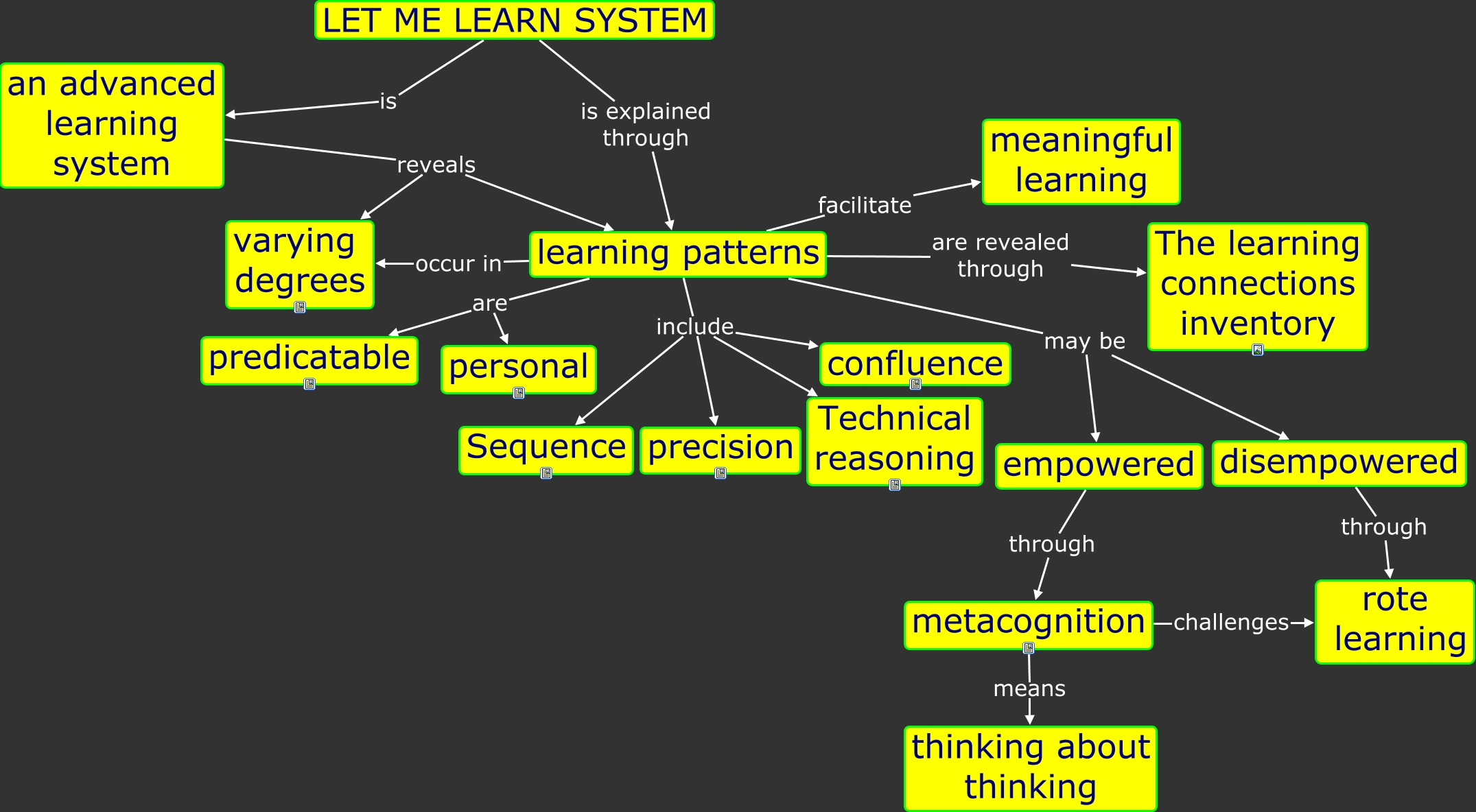 This Concept Map, created with IHMC CmapTools, has information related to: LML_SRHE, disempowered through rote learning, learning patterns may be disempowered, learning patterns are personal, learning patterns are predicatable, learning patterns may be empowered, LET ME LEARN SYSTEM is an advanced learning system, an advanced learning system reveals learning patterns, learning patterns occur in varying degrees, metacognition challenges rote learning, empowered through metacognition, learning patterns include Technical reasoning, an advanced learning system reveals varying degrees, learning patterns include Sequence, learning patterns facilitate meaningful learning, learning patterns include precision, metacognition means thinking about thinking, LET ME LEARN SYSTEM is explained through learning patterns, learning patterns include confluence, learning patterns are revealed through The learning connections inventory