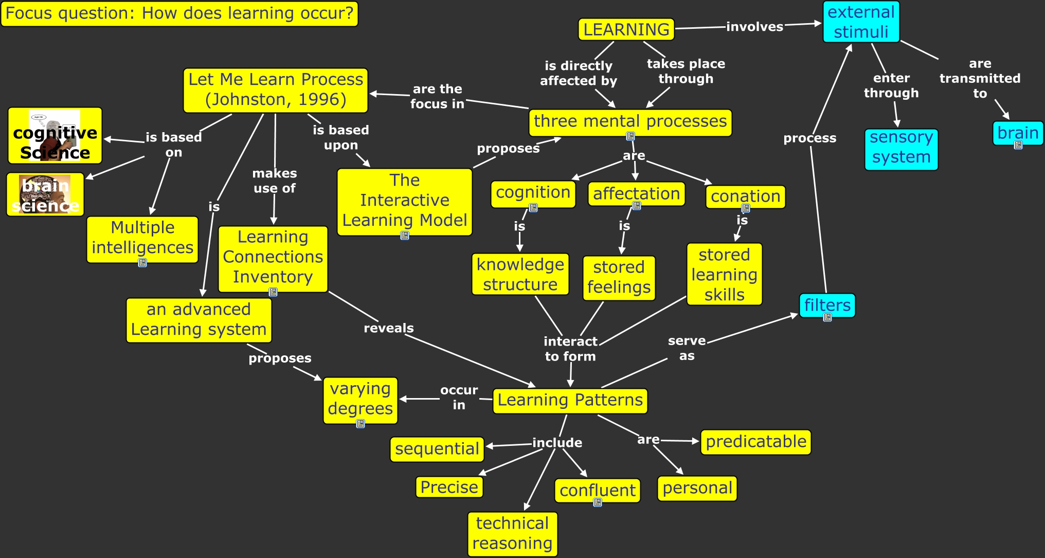 This Concept Map, created with IHMC CmapTools, has information related to: theory behind LML, filters process external stimuli, three mental processes are the focus in Let Me Learn Process (Johnston, 1996), cognition is knowledge structure, Learning Connections Inventory reveals Learning Patterns, stored learning skills interact to form Learning Patterns, Learning Patterns occur in varying degrees, Learning Patterns serve as filters, Let Me Learn Process (Johnston, 1996) is based on brain science, Learning Patterns include confluent, affectation is stored feelings, LEARNING is directly affected by three mental processes, The Interactive Learning Model proposes three mental processes, three mental processes are cognition, Let Me Learn Process (Johnston, 1996) makes use of Learning Connections Inventory, three mental processes are conation, Let Me Learn Process (Johnston, 1996) is based on Multiple intelligences, LEARNING takes place through three mental processes, an advanced Learning system proposes varying degrees, Learning Patterns are personal, three mental processes are affectation