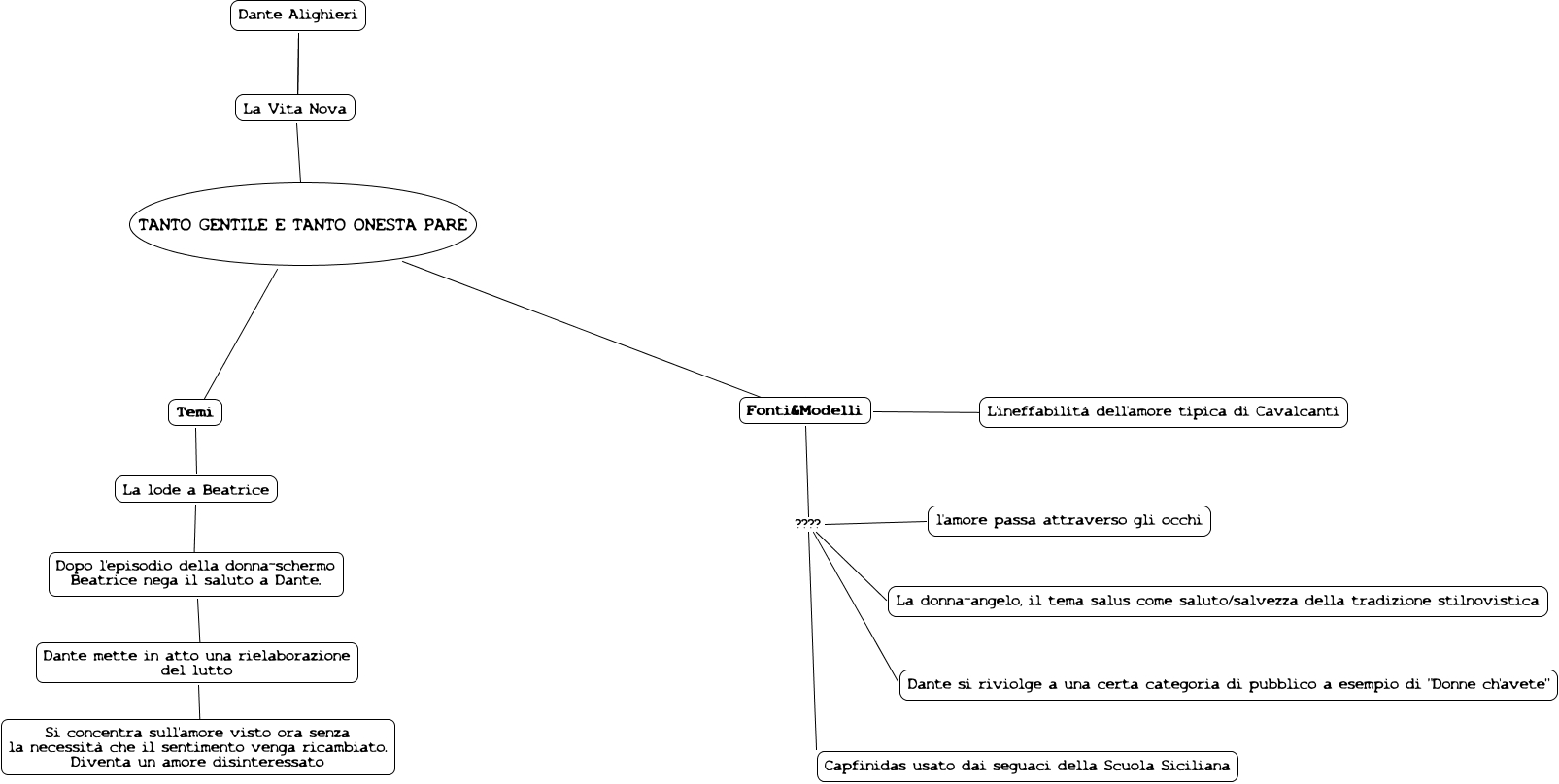 Questa Cmap, creata con IHMC CmapTools, contiene informazioni relative a: Tanto gentile e tanto onesta pare, La lode a Beatrice ???? Dopo l'episodio della donna-schermo Beatrice nega il saluto a Dante., La Vita Nova ???? Dante Alighieri, Fonti&Modelli ???? l'amore passa attraverso gli occhi, TANTO GENTILE E TANTO ONESTA PARE ???? Temi, Fonti&Modelli ???? L'ineffabilità dell'amore tipica di Cavalcanti, TANTO GENTILE E TANTO ONESTA PARE ???? Fonti&Modelli, Dante mette in atto una rielaborazione del lutto ???? Si concentra sull'amore visto ora senza la necessità che il sentimento venga ricambiato. Diventa un amore disinteressato, Fonti&Modelli ???? La donna-angelo, il tema salus come saluto/salvezza della tradizione stilnovistica, Dopo l'episodio della donna-schermo Beatrice nega il saluto a Dante. ???? Dante mette in atto una rielaborazione del lutto, Temi La lode a Beatrice, TANTO GENTILE E TANTO ONESTA PARE ???? La Vita Nova, Fonti&Modelli ???? Capfinidas usato dai seguaci della Scuola Siciliana, La Vita Nova ???? Dante Alighieri, Fonti&Modelli ???? Dante si riviolge a una certa categoria di pubblico a esempio di "Donne ch'avete"