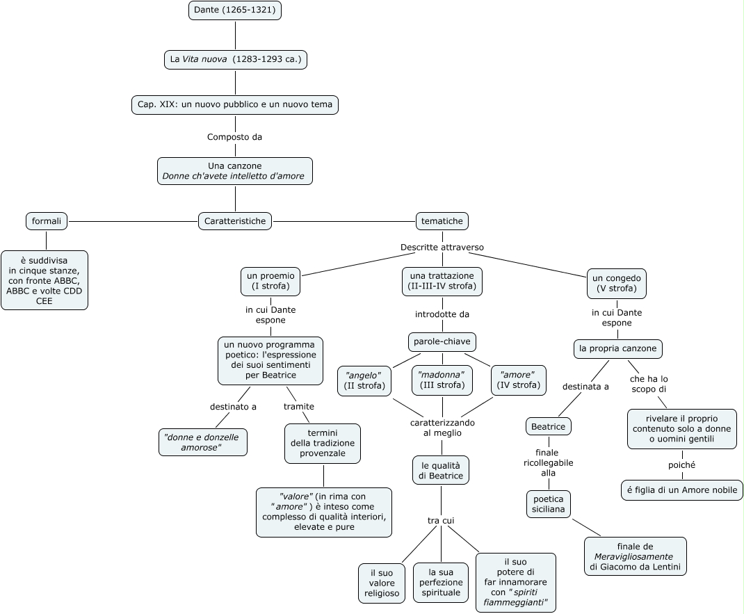 Questa Cmap, creata con IHMC CmapTools, contiene informazioni relative a: Gaia Mazzoleni - donne ch'avete intelletto d'amore, una trattazione (II-III-IV strofa) introdotte da parole-chiave, tematiche Descritte attraverso una trattazione (II-III-IV strofa), la propria canzone che ha lo scopo di rivelare il proprio contenuto solo a donne o uomini gentili, le qualità di Beatrice tra cui il suo valore religioso, un nuovo programma poetico: l'espressione dei suoi sentimenti per Beatrice destinato a "donne e donzelle amorose", Caratteristiche formali, parole-chiave "angelo" (II strofa), Caratteristiche tematiche, le qualità di Beatrice tra cui il suo potere di far innamorare con "spiriti fiammeggianti", parole-chiave "amore" (IV strofa), Cap. XIX: un nuovo pubblico e un nuovo tema Composto da Una canzone Donne ch'avete intelletto d'amore, Beatrice finale ricollegabile alla poetica siciliana, "madonna" (III strofa) caratterizzando al meglio le qualità di Beatrice, parole-chiave "madonna" (III strofa), "amore" (IV strofa) caratterizzando al meglio le qualità di Beatrice, "angelo" (II strofa) caratterizzando al meglio le qualità di Beatrice, rivelare il proprio contenuto solo a donne o uomini gentili poiché é figlia di un Amore nobile, un proemio (I strofa) in cui Dante espone un nuovo programma poetico: l'espressione dei suoi sentimenti per Beatrice, termini della tradizione provenzale "valore"(in rima con "amore") è inteso come complesso di qualità interiori, elevate e pure, un congedo (V strofa) in cui Dante espone la propria canzone