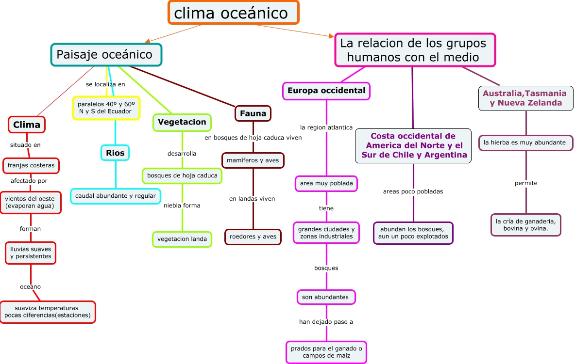 Este Cmap, tiene información relacionada con: oceanico 7, area muy poblada tiene grandes ciudades y zonas industriales, La relacion de los grupos humanos con el medio ???? Australia,Tasmania y Nueva Zelanda, Paisaje oceánico ???? Fauna, Vegetacion desarrolla bosques de hoja caduca, Europa occidental la region atlantica area muy poblada, Costa occidental de America del Norte y el Sur de Chile y Argentina areas poco pobladas abundan los bosques, aun un poco explotados, lluvias suaves y persistentes oceano suaviza temperaturas pocas diferencias(estaciones), Clima situado en franjas costeras, Paisaje oceánico ???? Clima, franjas costeras afectado por vientos del oeste (evaporan agua), La relacion de los grupos humanos con el medio ???? Europa occidental, grandes ciudades y zonas industriales bosques son abundantes, Rios ???? caudal abundante y regular, clima oceánico ???? La relacion de los grupos humanos con el medio, la hierba es muy abundante permite la cría de ganaderia, bovina y ovina., Fauna en bosques de hoja caduca viven mamíferos y aves, son abundantes han dejado paso a prados para el ganado o campos de maiz, vientos del oeste (evaporan agua) forman lluvias suaves y persistentes, La relacion de los grupos humanos con el medio ???? Costa occidental de America del Norte y el Sur de Chile y Argentina, Paisaje oceánico se localiza en paralelos 40º y 60º N y S del Ecuador
