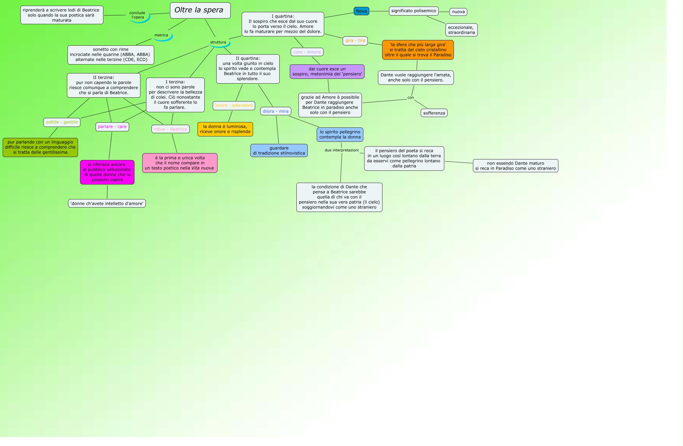 Questa Cmap, creata con IHMC CmapTools, contiene informazioni relative a: Oltre la spera Chiara C, I quartina: Il sospiro che esce dal suo cuore lo porta verso il cielo. Amore lo fa maturare per mezzo del dolore. gira - tira, II quartina: una volta giunto in cielo lo spirito vede e contempla Beatrice in tutto il suo splendore. onore - splendore, disira - mira guardare di tradizione stilnovistica, Oltre la spera metrica sonetto con rime incrociate nelle quarine (ABBA, ABBA) alternate nelle terzine (CDE, ECD), ridice - Beatrice è la prima e unica volta che il nome compare in un testo poetico nella Vita nuova, Oltre la spera struttura II quartina: una volta giunto in cielo lo spirito vede e contempla Beatrice in tutto il suo splendore., disira - mira lo spirito pellegrino contempla la donna, I terzina: non ci sono parole per descrivere la bellezza di colei. Ciò nonostante il cuore sofferente lo fa parlare. ridice - Beatrice, Nova significato polisemico, I quartina: Il sospiro che esce dal suo cuore lo porta verso il cielo. Amore lo fa maturare per mezzo del dolore. Nova, II terzina: pur non capendo le parole riesce comunque a comprendere che si parla di Beatrice. parlare - care, II terzina: pur non capendo le parole riesce comunque a comprendere che si parla di Beatrice. ridice - Beatrice, Oltre la spera struttura I terzina: non ci sono parole per descrivere la bellezza di colei. Ciò nonostante il cuore sofferente lo fa parlare., sottile - gentile pur parlando con un linguaggio difficile riesce a comprendere che si tratta delle gentilissima, I quartina: Il sospiro che esce dal suo cuore lo porta verso il cielo. Amore lo fa maturare per mezzo del dolore. core - Amore, il pensiero del poeta si reca in un luogo così lontano dalla terra da esservi come pellegrino lontano dalla patria non essendo Dante maturo si reca in Paradiso come uno straniero, si riferisce ancora al pubblico selezionato di quelle donne che lo possono capire 'donne ch'avete intelletto d'amore', II terzina: pur non capendo le parole riesce comunque a comprendere che si parla di Beatrice. sottile - gentile, lo spirito pellegrino contempla la donna due interpretazioni il pensiero del poeta si reca in un luogo così lontano dalla terra da esservi come pellegrino lontano dalla patria, dal cuore esce un sospiro, metonimia del 'pensiero' grazie ad Amore è possibile per Dante raggiungere Beatrice in paradiso anche solo con il pensiero