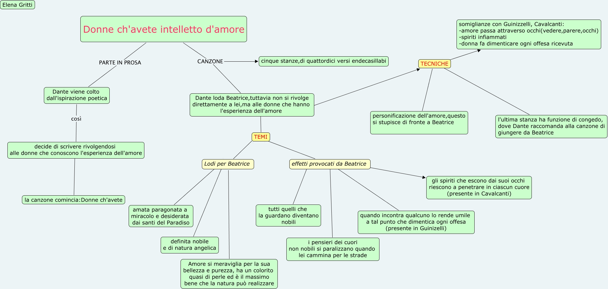 Questa Cmap, creata con IHMC CmapTools, contiene informazioni relative a: Donne ch'avete intelletto d'amore-Elena Gritti, Dante loda Beatrice,tuttavia non si rivolge direttamente a lei,ma alle donne che hanno l'esperienza dell'amore TECNICHE, decide di scrivere rivolgendosi alle donne che conoscono l'esperienza dell'amore la canzone comincia:Donne ch'avete, Dante loda Beatrice,tuttavia non si rivolge direttamente a lei,ma alle donne che hanno l'esperienza dell'amore TEMI, Donne ch'avete intelletto d'amore CANZONE Dante loda Beatrice,tuttavia non si rivolge direttamente a lei,ma alle donne che hanno l'esperienza dell'amore, TEMI effetti provocati da Beatrice, Donne ch'avete intelletto d'amore PARTE IN PROSA Dante viene colto dall'ispirazione poetica, Dante viene colto dall'ispirazione poetica così decide di scrivere rivolgendosi alle donne che conoscono l'esperienza dell'amore, effetti provocati da Beatrice tutti quelli che la guardano diventano nobili, TECNICHE somiglianze con Guinizzelli, Cavalcanti: -amore passa attraverso occhi(vedere,parere,occhi) -spiriti infiammati -donna fa dimenticare ogni offesa ricevuta, Donne ch'avete intelletto d'amore CANZONE cinque stanze,di quattordici versi endecasillabi, TECNICHE personificazione dell'amore,questo si stupisce di fronte a Beatrice, effetti provocati da Beatrice quando incontra qualcuno lo rende umile a tal punto che dimentica ogni offesa (presente in Guinizelli), Lodi per Beatrice amata paragonata a miracolo e desiderata dai santi del Paradiso, effetti provocati da Beatrice gli spiriti che escono dai suoi occhi riescono a penetrare in ciascun cuore (presente in Cavalcanti), Lodi per Beatrice Amore si meraviglia per la sua bellezza e purezza, ha un colorito quasi di perle ed è il massimo bene che la natura può realizzare, TECNICHE l'ultima stanza ha funzione di congedo, dove Dante raccomanda alla canzone di giungere da Beatrice, TEMI Lodi per Beatrice, effetti provocati da Beatrice i pensieri dei cuori non nobili si paralizzano quando lei cammina per le strade, Lodi per Beatrice definita nobile e di natura angelica