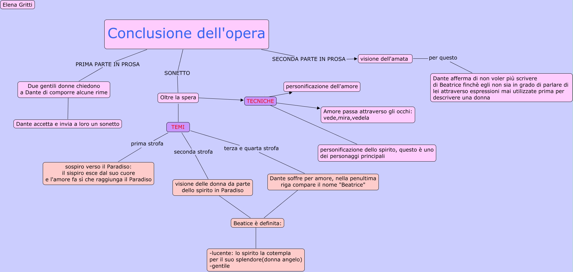 Questa Cmap, creata con IHMC CmapTools, contiene informazioni relative a: Conclusione dell'opera-Elena Gritti, TEMI terza e quarta strofa Dante soffre per amore, nella penultima riga compare il nome "Beatrice", Beatice è definita: -lucente: lo spirito la cotempla per il suo splendore(donna angelo) -gentile, TECNICHE Amore passa attraverso gli occhi: vede,mira,vedela, Dante soffre per amore, nella penultima riga compare il nome "Beatrice" Beatice è definita:, visione dell'amata per questo Dante afferma di non voler più scrivere di Beatrice finchè egli non sia in grado di parlare di lei attraverso espressioni mai utilizzate prima per descrivere una donna, TEMI prima strofa sospiro verso il Paradiso: il sispiro esce dal suo cuore e l'amore fa sì che raggiunga il Paradiso, Oltre la spera TEMI, Conclusione dell'opera SONETTO Oltre la spera, Oltre la spera TECNICHE, Conclusione dell'opera PRIMA PARTE IN PROSA Due gentili donne chiedono a Dante di comporre alcune rime, TECNICHE personificazione dell'amore, TEMI seconda strofa visione delle donna da parte dello spirito in Paradiso, visione delle donna da parte dello spirito in Paradiso Beatice è definita:, Conclusione dell'opera SECONDA PARTE IN PROSA visione dell'amata, Due gentili donne chiedono a Dante di comporre alcune rime Dante accetta e invia a loro un sonetto, TECNICHE personificazione dello spirito, questo è uno dei personaggi principali