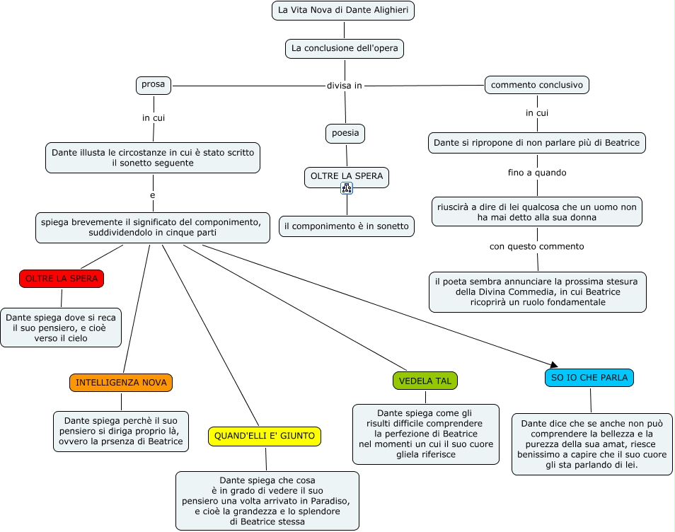 Questa Cmap, creata con IHMC CmapTools, contiene informazioni relative a: Miriana-La conclusione dell'opera, OLTRE LA SPERA il componimento è in sonetto, VEDELA TAL Dante spiega come gli risulti difficile comprendere la perfezione di Beatrice nel momenti un cui il suo cuore gliela riferisce, La Vita Nova di Dante Alighieri La conclusione dell'opera, spiega brevemente il significato del componimento, suddividendolo in cinque parti SO IO CHE PARLA, SO IO CHE PARLA Dante dice che se anche non può comprendere la bellezza e la purezza della sua amat, riesce benissimo a capire che il suo cuore gli sta parlando di lei., OLTRE LA SPERA Dante spiega dove si reca il suo pensiero, e cioè verso il cielo, QUAND'ELLI E' GIUNTO Dante spiega che cosa è in grado di vedere il suo pensiero una volta arrivato in Paradiso, e cioè la grandezza e lo splendore di Beatrice stessa, INTELLIGENZA NOVA Dante spiega perchè il suo pensiero si diriga proprio là, ovvero la prsenza di Beatrice, poesia OLTRE LA SPERA, spiega brevemente il significato del componimento, suddividendolo in cinque parti VEDELA TAL, spiega brevemente il significato del componimento, suddividendolo in cinque parti QUAND'ELLI E' GIUNTO, spiega brevemente il significato del componimento, suddividendolo in cinque parti INTELLIGENZA NOVA, La conclusione dell'opera divisa in commento conclusivo, spiega brevemente il significato del componimento, suddividendolo in cinque parti OLTRE LA SPERA, La conclusione dell'opera divisa in poesia, commento conclusivo in cui Dante si ripropone di non parlare più di Beatrice, Dante si ripropone di non parlare più di Beatrice fino a quando riuscirà a dire di lei qualcosa che un uomo non ha mai detto alla sua donna, riuscirà a dire di lei qualcosa che un uomo non ha mai detto alla sua donna con questo commento il poeta sembra annunciare la prossima stesura della Divina Commedia, in cui Beatrice ricoprirà un ruolo fondamentale, Dante illusta le circostanze in cui è stato scritto il sonetto seguente e spiega brevemente il significato del componimento, suddividendolo in cinque parti, La conclusione dell'opera divisa in prosa