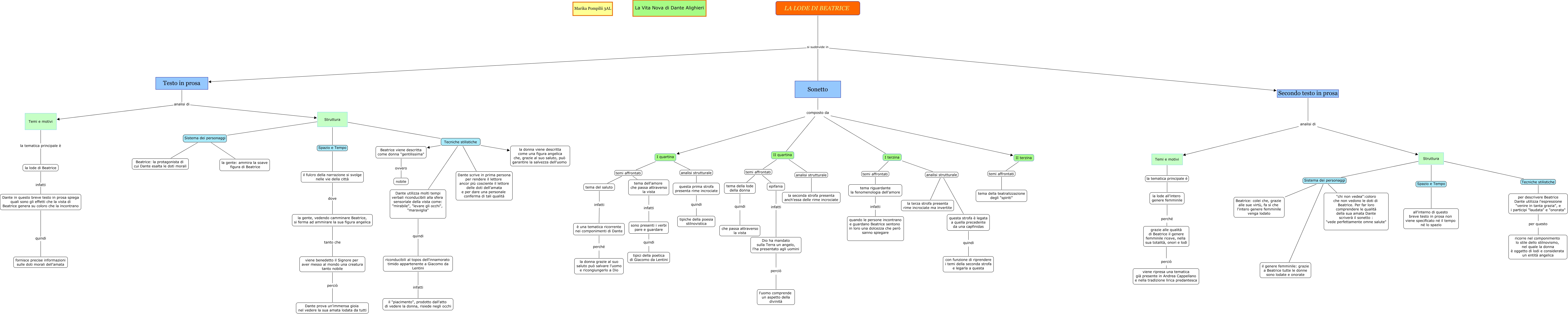 Questa Cmap, creata con IHMC CmapTools, contiene informazioni relative a: Tanto gentile e tanto onesta pare Marika Pompilii, Beatrice viene descritta come donna "gentilissima" ovvero nobile, è una tematica ricorrente nei componimenti di Dante perché la donna grazie al suo saluto può salvare l'uomo e ricongiungerlo a Dio, Struttura Sistema dei personaggi Beatrice: colei che, grazie alle sue virtù, fa sì che l'intero genere femminile venga lodato, I quartina analisi strutturale questa prima strofa presenta rime incrociate, I quartina temi affrontati tema dell'amore che passa attraverso la vista, Sonetto composto da II terzina, II quartina analisi strutturale la seconda strofa presenta anch'essa delle rime incrociate, epifania infatti Dio ha mandato sulla Terra un angelo, l'ha presentato agli uomini, Struttura Sistema dei personaggi la gente: ammira la soave figura di Beatrice, II quartina temi affrontati epifania, Dante in questo breve testo in prosa spiega quali sono gli effetti che la vista di Beatrice genera su coloro che la incontrano quindi fornisce precise informazioni sulle doti morali dell'amata, viene benedetto il Signore per aver messo al mondo una creatura tanto nobile perciò Dante prova un'immensa gioia nel vedere la sua amata lodata da tutti, tema della lode della donna quindi che passa attraverso la vista, Struttura Sistema dei personaggi Beatrice: la protagonista di cui Dante esalta le doti morali, tema riguardante la fenomenologia dell'amore infatti quando le persone incontrano e guardano Beatrice sentono in loro una dolcezza che però sanno spiegare, questa prima strofa presenta rime incrociate quindi tipiche della poesia stilnovistica, Temi e motivi la tematica principale è la lode di Beatrice, grazie alle qualità di Beatrice il genere femminile riceve, nella sua totalità, onori e lodi perciò viene ripresa una tematica già presente in Andrea Cappellano e nella tradizione lirica predantesca, Secondo testo in prosa analisi di Struttura, I terzina analisi strutturale questa strofa è legata a quella precedente da una capfinidas