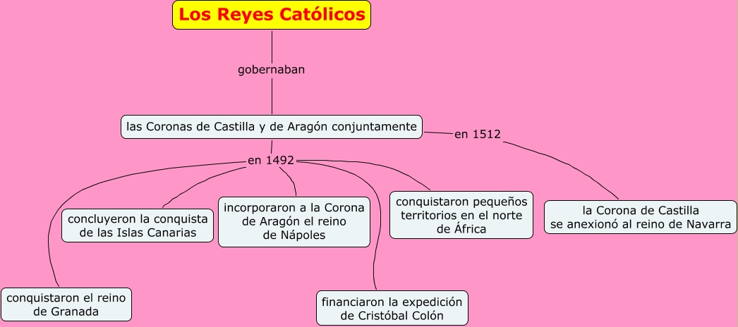 Este Cmap, tiene información relacionada con: Los Reyes Católicos, las Coronas de Castilla y de Aragón conjuntamente en 1492 incorporaron a la Corona de Aragón el reino de Nápoles, las Coronas de Castilla y de Aragón conjuntamente en 1492 concluyeron la conquista de las Islas Canarias, Los Reyes Católicos gobernaban las Coronas de Castilla y de Aragón conjuntamente, las Coronas de Castilla y de Aragón conjuntamente en 1512 la Corona de Castilla se anexionó al reino de Navarra, las Coronas de Castilla y de Aragón conjuntamente en 1492 financiaron la expedición de Cristóbal Colón, las Coronas de Castilla y de Aragón conjuntamente en 1492 conquistaron el reino de Granada, las Coronas de Castilla y de Aragón conjuntamente en 1492 conquistaron pequeños territorios en el norte de África