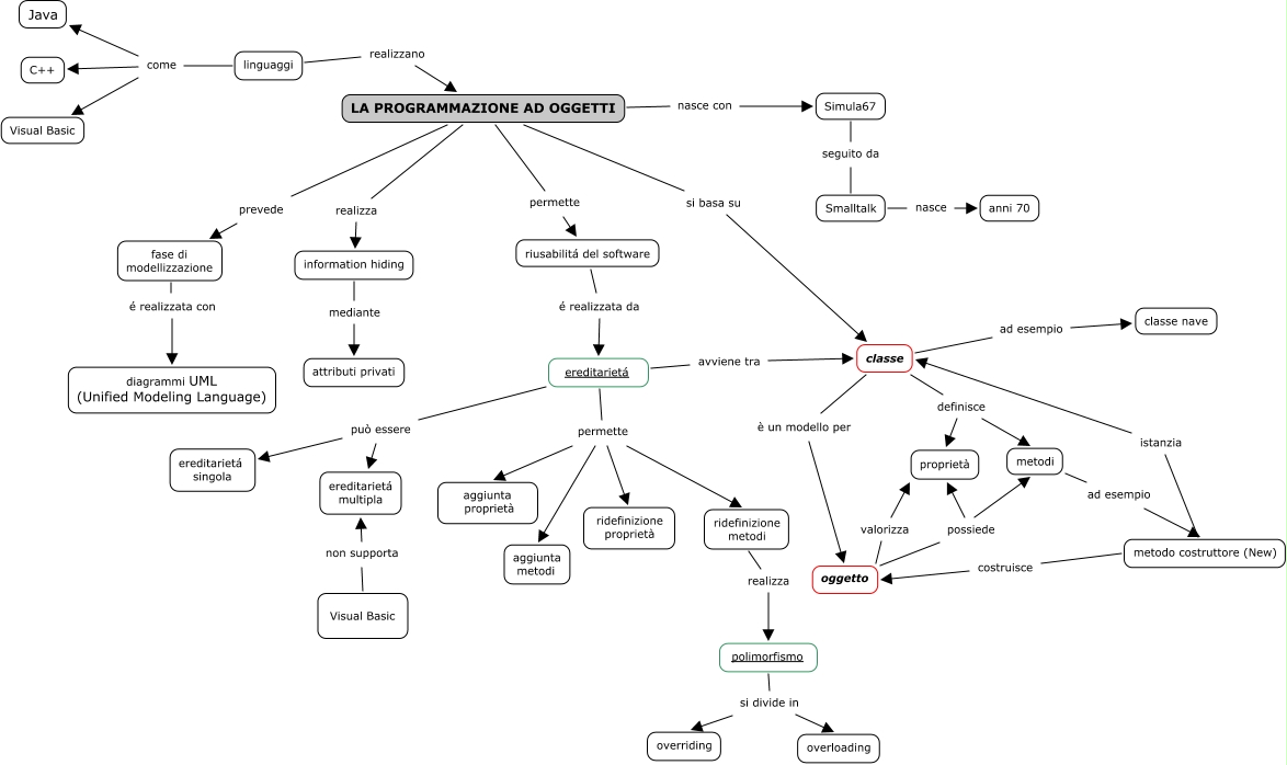 Questa Cmap, creata con IHMC CmapTools, contiene informazioni relative a: concettigenerali, classe è un modello per oggetto, LA PROGRAMMAZIONE AD OGGETTI realizza information hiding, linguaggi come Visual Basic, ereditarietá può essere ereditarietá singola, linguaggi realizzano LA PROGRAMMAZIONE AD OGGETTI, ereditarietá avviene tra classe, Smalltalk nasce anni 70, polimorfismo si divide in overriding, metodi ad esempio metodo costruttore (New), LA PROGRAMMAZIONE AD OGGETTI nasce con Simula67, classe ad esempio classe nave, linguaggi come C++, linguaggi come Java, ereditarietá permette aggiunta proprietà, classe definisce proprietà, riusabilitá del software é realizzata da ereditarietá, metodo costruttore (New) istanzia classe, ereditarietá permette ridefinizione proprietà, ereditarietá permette aggiunta metodi, polimorfismo si divide in overloading