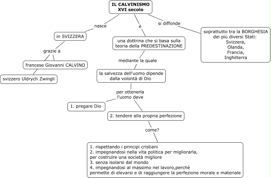 Questa Cmap, creata con IHMC CmapTools, contiene informazioni relative a: 9.calvinismo, IL CALVINISMO XVI secolo si diffonde soprattutto tra la BORGHESIA dei più diversi Stati: Svizzera, Olanda, Francia, Inghilterra, la salvezza dell'uomo dipende dalla volontà di Dio per ottenerla l'uomo deve 1. pregare Dio, IL CALVINISMO XVI secolo nasce in SVIZZERA, in SVIZZERA grazie a svizzero Uldrych Zwingli, in SVIZZERA grazie a francese Giovanni CALVINO, una dottrina che si basa sulla teoria della PREDESTINAZIONE mediante la quale la salvezza dell'uomo dipende dalla volontà di Dio, la salvezza dell'uomo dipende dalla volontà di Dio per ottenerla l'uomo deve 2. tendere alla propria perfezione, IL CALVINISMO XVI secolo è una dottrina che si basa sulla teoria della PREDESTINAZIONE, 2. tendere alla propria perfezione come? 1. rispettando i principi cristiani 2. impegnandosi nella vita politica per migliorarla, per costruire una società migliore 3. senza isolarsi dal mondo 4. impegnandosi al massimo nel lavoro,perchè permette di elevarsi e di raggiungere la perfezione morale e materiale