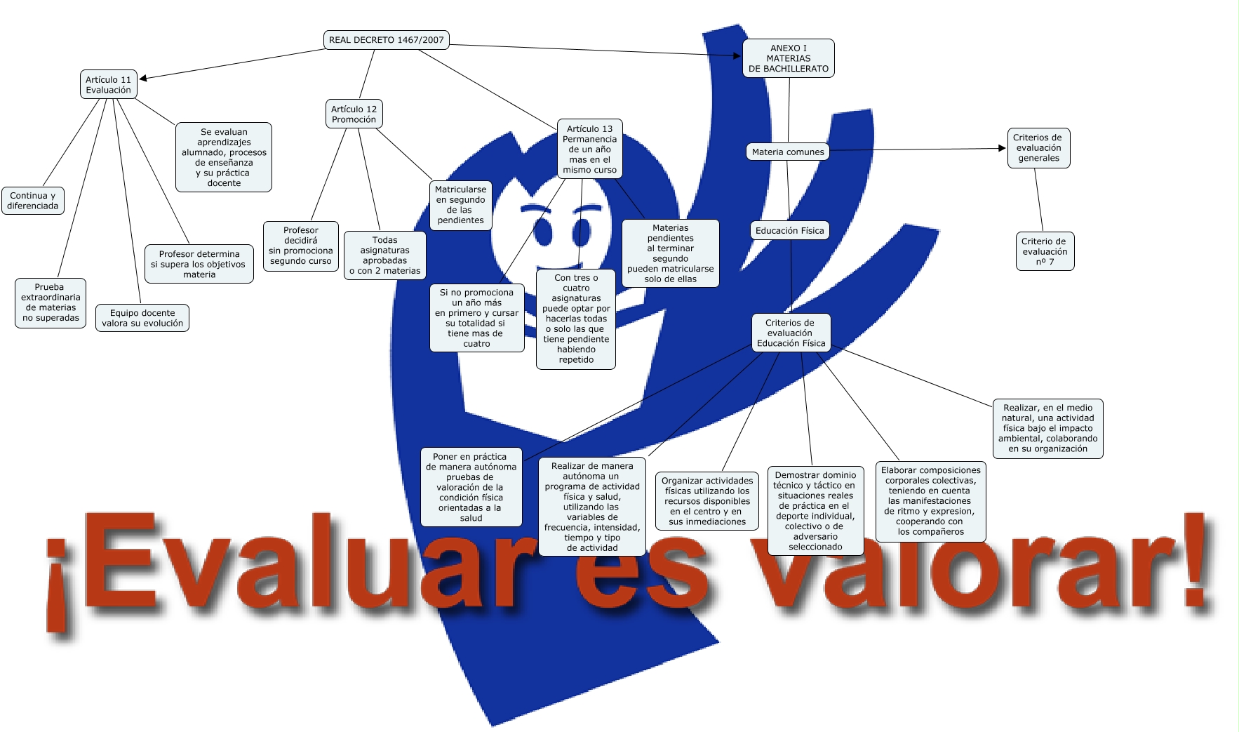Este Cmap, tiene información relacionada con: Real Decreto 1467 2007 (estatal), REAL DECRETO 1467/2007 ???? ANEXO I MATERIAS DE BACHILLERATO, Criterios de evaluación Educación Física ???? Elaborar composiciones corporales colectivas, teniendo en cuenta las manifestaciones de ritmo y expresion, cooperando con los compañeros, Artículo 12 Promoción ???? Todas asignaturas aprobadas o con 2 materias, Criterios de evaluación Educación Física ???? Realizar de manera autónoma un programa de actividad física y salud, utilizando las variables de frecuencia, intensidad, tiempo y tipo de actividad, Artículo 13 Permanencia de un año mas en el mismo curso ???? Con tres o cuatro asignaturas puede optar por hacerlas todas o solo las que tiene pendiente habiendo repetido, Artículo 13 Permanencia de un año mas en el mismo curso ???? Si no promociona un año más en primero y cursar su totalidad si tiene mas de cuatro, Criterios de evaluación Educación Física ???? Demostrar dominio técnico y táctico en situaciones reales de práctica en el deporte individual, colectivo o de adversario seleccionado, Artículo 11 Evaluación ???? Se evaluan aprendizajes alumnado, procesos de enseñanza y su práctica docente, Criterios de evaluación Educación Física ???? Organizar actividades físicas utilizando los recursos disponibles en el centro y en sus inmediaciones, REAL DECRETO 1467/2007 ???? Artículo 13 Permanencia de un año mas en el mismo curso, Artículo 11 Evaluación ???? Profesor determina si supera los objetivos materia, Artículo 13 Permanencia de un año mas en el mismo curso ???? Materias pendientes al terminar segundo pueden matricularse solo de ellas, Criterios de evaluación generales ???? Criterio de evaluación nº 7, REAL DECRETO 1467/2007 ???? Artículo 12 Promoción, Artículo 11 Evaluación ???? Prueba extraordinaria de materias no superadas, Materia comunes ???? Criterios de evaluación generales, ANEXO I MATERIAS DE BACHILLERATO ???? Materia comunes, Materia comunes ???? Educación Física, REAL DECRETO 1467/2007 ???? Artículo 11 Evaluación, Artículo 11 Evaluación ???? Equipo docente valora su evolución