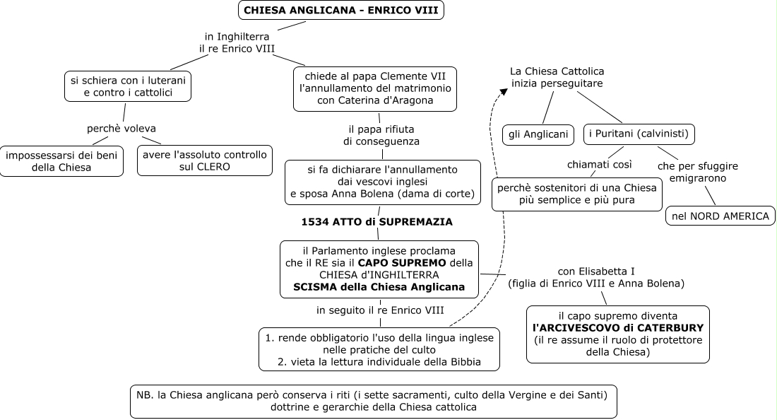 Questa Cmap, creata con IHMC CmapTools, contiene informazioni relative a: 10.chiesa_anglicana, chiede al papa Clemente VII l'annullamento del matrimonio con Caterina d'Aragona il papa rifiuta di conseguenza si fa dichiarare l'annullamento dai vescovi inglesi e sposa Anna Bolena (dama di corte), i Puritani (calvinisti) che per sfuggire emigrarono nel NORD AMERICA, il Parlamento inglese proclama che il RE sia il CAPO SUPREMO della CHIESA d'INGHILTERRA SCISMA della Chiesa Anglicana con Elisabetta I (figlia di Enrico VIII e Anna Bolena) il capo supremo diventa l'ARCIVESCOVO di CATERBURY (il re assume il ruolo di protettore della Chiesa), 1. rende obbligatorio l'uso della lingua inglese nelle pratiche del culto 2. vieta la lettura individuale della Bibbia La Chiesa Cattolica inizia perseguitare gli Anglicani, si schiera con i luterani e contro i cattolici perchè voleva impossessarsi dei beni della Chiesa, si schiera con i luterani e contro i cattolici perchè voleva avere l'assoluto controllo sul CLERO, CHIESA ANGLICANA - ENRICO VIII in Inghilterra il re Enrico VIII si schiera con i luterani e contro i cattolici, il Parlamento inglese proclama che il RE sia il CAPO SUPREMO della CHIESA d'INGHILTERRA SCISMA della Chiesa Anglicana in seguito il re Enrico VIII 1. rende obbligatorio l'uso della lingua inglese nelle pratiche del culto 2. vieta la lettura individuale della Bibbia, CHIESA ANGLICANA - ENRICO VIII in Inghilterra il re Enrico VIII chiede al papa Clemente VII l'annullamento del matrimonio con Caterina d'Aragona, 1. rende obbligatorio l'uso della lingua inglese nelle pratiche del culto 2. vieta la lettura individuale della Bibbia La Chiesa Cattolica inizia perseguitare i Puritani (calvinisti), si fa dichiarare l'annullamento dai vescovi inglesi e sposa Anna Bolena (dama di corte) 1534 ATTO di SUPREMAZIA il Parlamento inglese proclama che il RE sia il CAPO SUPREMO della CHIESA d'INGHILTERRA SCISMA della Chiesa Anglicana, i Puritani (calvinisti) chiamati così perchè sostenitori di una Chiesa più semplice e più pura