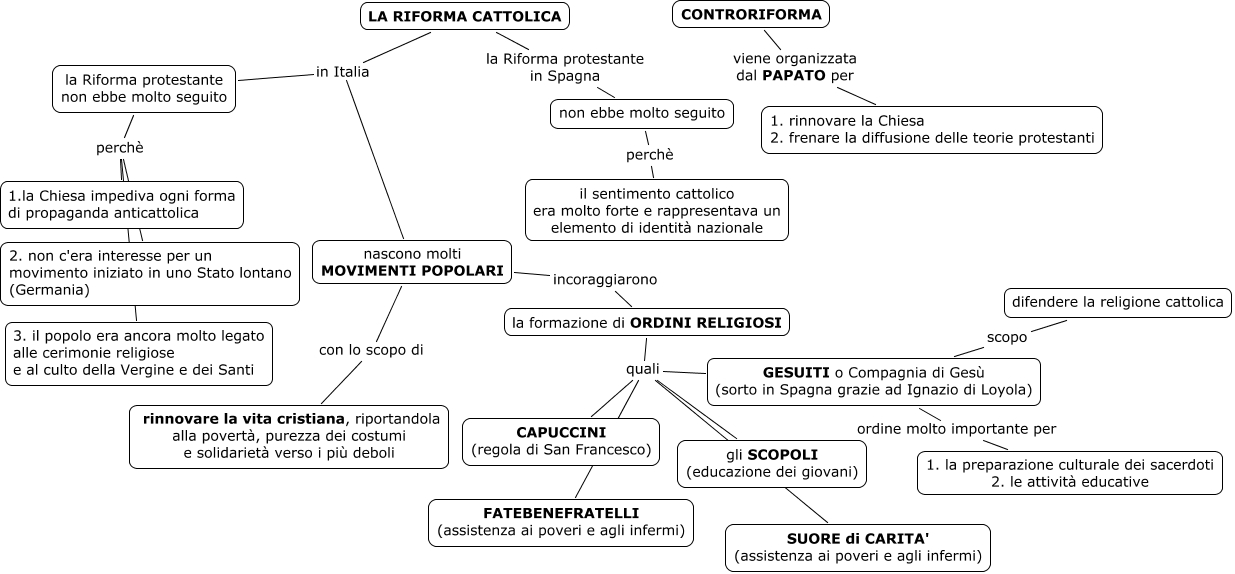 Questa Cmap, creata con IHMC CmapTools, contiene informazioni relative a: 11.controriforma_cattolica, nascono molti MOVIMENTI POPOLARI incoraggiarono la formazione di ORDINI RELIGIOSI, la formazione di ORDINI RELIGIOSI quali CAPUCCINI (regola di San Francesco), LA RIFORMA CATTOLICA la Riforma protestante in Spagna non ebbe molto seguito, GESUITI o Compagnia di Gesù (sorto in Spagna grazie ad Ignazio di Loyola) ordine molto importante per 1. la preparazione culturale dei sacerdoti 2. le attività educative, la formazione di ORDINI RELIGIOSI quali FATEBENEFRATELLI (assistenza ai poveri e agli infermi), la Riforma protestante non ebbe molto seguito perchè 2. non c'era interesse per un movimento iniziato in uno Stato lontano (Germania), non ebbe molto seguito perchè il sentimento cattolico era molto forte e rappresentava un elemento di identità nazionale, CONTRORIFORMA viene organizzata dal PAPATO per 1. rinnovare la Chiesa 2. frenare la diffusione delle teorie protestanti, nascono molti MOVIMENTI POPOLARI con lo scopo di rinnovare la vita cristiana, riportandola alla povertà, purezza dei costumi e solidarietà verso i più deboli, la Riforma protestante non ebbe molto seguito perchè 1.la Chiesa impediva ogni forma di propaganda anticattolica, la formazione di ORDINI RELIGIOSI quali SUORE di CARITA' (assistenza ai poveri e agli infermi), la formazione di ORDINI RELIGIOSI quali gli SCOPOLI (educazione dei giovani), GESUITI o Compagnia di Gesù (sorto in Spagna grazie ad Ignazio di Loyola) scopo difendere la religione cattolica, la Riforma protestante non ebbe molto seguito perchè 3. il popolo era ancora molto legato alle cerimonie religiose e al culto della Vergine e dei Santi, la formazione di ORDINI RELIGIOSI quali GESUITI o Compagnia di Gesù (sorto in Spagna grazie ad Ignazio di Loyola), LA RIFORMA CATTOLICA in Italia nascono molti MOVIMENTI POPOLARI, LA RIFORMA CATTOLICA in Italia la Riforma protestante non ebbe molto seguito