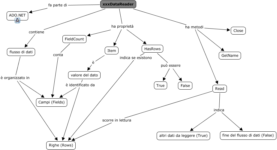 Questa Cmap, creata con IHMC CmapTools, contiene informazioni relative a: xxxDataReader, flusso di dati è organizzato in Righe (Rows), HasRows può essere True, Read indica fine del flusso di dati (False), Item è valore del dato, valore del dato è identificato da Campi (Fields), xxxDataReader ha proprietà Item, xxxDataReader contiene flusso di dati, xxxDataReader ha metodi Close, HasRows indica se esistono Righe (Rows), valore del dato è identificato da Righe (Rows), FieldCount conta Campi (Fields), Read scorre in lettura Righe (Rows), xxxDataReader ha metodi Read, flusso di dati è organizzato in Campi (Fields), xxxDataReader ha proprietà FieldCount, xxxDataReader ha metodi GetName, xxxDataReader fa parte di ADO.NET, xxxDataReader ha proprietà HasRows, Read indica altri dati da leggere (True), HasRows può essere False