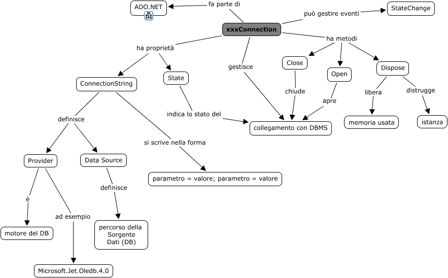 Questa Cmap, creata con IHMC CmapTools, contiene informazioni relative a: xxxConnection, ConnectionString si scrive nella forma parametro = valore; parametro = valore, Provider ad esempio Microsoft.Jet.Oledb.4.0, xxxConnection ha proprietà ConnectionString, xxxConnection ha metodi Close, Open apre collegamento con DBMS, State indica lo stato del collegamento con DBMS, Data Source definisce percorso della Sorgente Dati (DB), ConnectionString definisce Data Source, Dispose libera memoria usata, xxxConnection ha metodi Dispose, xxxConnection fa parte di ADO.NET, ConnectionString definisce Provider, Close chiude collegamento con DBMS, xxxConnection ha metodi Open, Dispose distrugge istanza, xxxConnection ha proprietà State, xxxConnection gestisce collegamento con DBMS, xxxConnection può gestire eventi StateChange, Provider è motore del DB