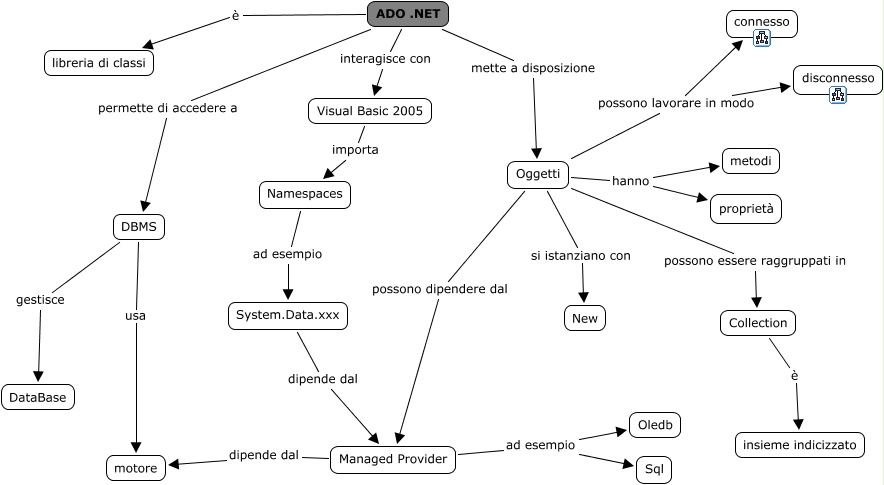Questa Cmap, creata con IHMC CmapTools, contiene informazioni relative a: ado, Oggetti hanno proprietà, DBMS gestisce DataBase, Managed Provider dipende dal motore, Oggetti possono lavorare in modo connesso, Oggetti possono essere raggruppati in Collection, Oggetti possono lavorare in modo disconnesso, ADO .NET mette a disposizione Oggetti, ADO .NET è libreria di classi, System.Data.xxx dipende dal Managed Provider, Oggetti si istanziano con New, Collection è insieme indicizzato, Managed Provider ad esempio Oledb, Visual Basic 2005 importa Namespaces, DBMS usa motore, Managed Provider ad esempio Sql, ADO .NET permette di accedere a DBMS, ADO .NET interagisce con Visual Basic 2005, Oggetti hanno metodi, Namespaces ad esempio System.Data.xxx, Oggetti possono dipendere dal Managed Provider