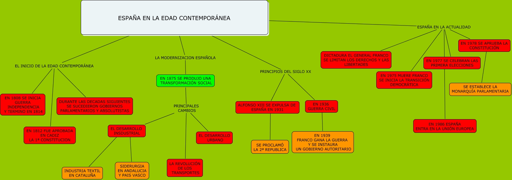 Este Cmap, tiene información relacionada con: ESPAÑA EDAD CONTEMPORANEA, EN 1875 SE PRODUJO UNA TRANSFORMACIÓN SOCIAL PRINCIPALES CAMBIOS LA REVOLUCIÓN DE LOS TRANSPORTES, EL DESARROLLO INSDUSTRIAL ???? SIDERURGIA EN ANDALUCIA Y PAIS VASCO, ESPAÑA EN LA EDAD CONTEMPORÁNEA ESPAÑA EN LA ACTUALIDAD EN 1978 SE APRUEBA LA CONSTITUCIÓN, ESPAÑA EN LA EDAD CONTEMPORÁNEA EL INICIO DE LA EDAD CONTEMPORÁNEA DURANTE LAS DECADAS SIGUIENTES SE SUCEDIERON GOBIERNOS PARLAMENTARIOS Y ABSOLUTISTAS, ESPAÑA EN LA EDAD CONTEMPORÁNEA ESPAÑA EN LA ACTUALIDAD EN 1986 ESPAÑA ENTRA EN LA UNIÓN EUROPEA, ESPAÑA EN LA EDAD CONTEMPORÁNEA ESPAÑA EN LA ACTUALIDAD EN 1977 SE CELEBRAN LAS PRIMERA ELECCIONES, ESPAÑA EN LA EDAD CONTEMPORÁNEA EL INICIO DE LA EDAD CONTEMPORÁNEA EN 1808 SE INICIA GUERRA INDEPENDENCIA Y TERMINO EN 1814, EN 1936 GUERRA CIVIL ???? EN 1939 FRANCO GANA LA GUERRA Y SE INSTAURA UN GOBIERNO AUTORITARIO, ESPAÑA EN LA EDAD CONTEMPORÁNEA EL INICIO DE LA EDAD CONTEMPORÁNEA EN 1812 FUE APROBADA EN CADIZ LA 1ª CONSTITUCION, ESPAÑA EN LA EDAD CONTEMPORÁNEA ESPAÑA EN LA ACTUALIDAD DICTADURA EL GENERAL FRANCO SE LIMITAN LOS DERECHOS Y LAS LIBERTADES, ALFONSO XIII SE EXPULSA DE ESPAÑA EN 1931 ???? SE PROCLAMÓ LA 2ª REPUBLICA, EN 1978 SE APRUEBA LA CONSTITUCIÓN ???? SE ESTABLECE LA MONARQUÍA PARLAMENTARIA, EN 1875 SE PRODUJO UNA TRANSFORMACIÓN SOCIAL PRINCIPALES CAMBIOS EL DESARROLLO INSDUSTRIAL, EL DESARROLLO INSDUSTRIAL ???? INDUSTRIA TEXTIL EN CATALUÑA, ESPAÑA EN LA EDAD CONTEMPORÁNEA PRINCIPIOS DEL SIGLO XX ALFONSO XIII SE EXPULSA DE ESPAÑA EN 1931, ESPAÑA EN LA EDAD CONTEMPORÁNEA PRINCIPIOS DEL SIGLO XX EN 1936 GUERRA CIVIL, ESPAÑA EN LA EDAD CONTEMPORÁNEA ESPAÑA EN LA ACTUALIDAD EN 1975 MUERE FRANCO SE INICIA LA TRANSICIÓN DEMOCRÁTICA, EN 1875 SE PRODUJO UNA TRANSFORMACIÓN SOCIAL PRINCIPALES CAMBIOS EL DESARROLLO URBANO, ESPAÑA EN LA EDAD CONTEMPORÁNEA LA MODERNIZACION ESPAÑOLA EN 1875 SE PRODUJO UNA TRANSFORMACIÓN SOCIAL