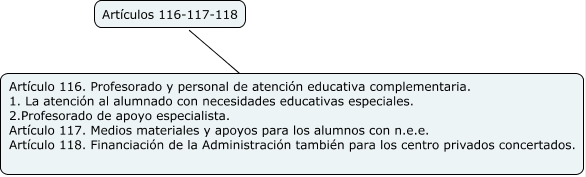 Este Cmap, tiene información relacionada con: ARTÍCULOS 116,117,118, Artículos 116-117-118 ???? Artículo 116. Profesorado y personal de atención educativa complementaria. 1. La atención al alumnado con necesidades educativas especiales. 2.Profesorado de apoyo especialista. Artículo 117. Medios materiales y apoyos para los alumnos con n.e.e. Artículo 118. Financiación de la Administración también para los centro privados concertados.