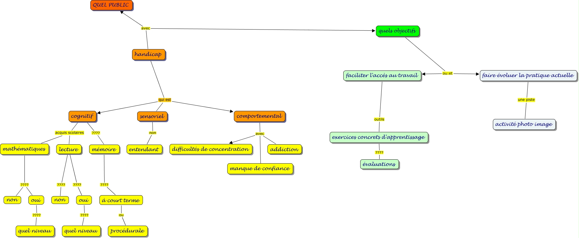 Cette carte de concepts créée avec IHMC CmapTools traite de: sajo, quels objectifs ou:et faciliter l'accès au travail, handicap qui est cognitif, handicap avec QUEL PUBLIC, handicap qui est sensoriel, exercices concrets d'apprentissage ???? évaluations, handicap qui est comportemental, comportemental avec addiction, faciliter l'accès au travail outils exercices concrets d'apprentissage, lecture ???? oui, cognitif acquis scolaires lecture, cognitif ???? mémoire, lecture ???? non, comportemental avec ????, handicap avec quels objectifs, mathématiques ???? non, cognitif acquis scolaires mathématiques, oui ???? quel niveau, oui ???? quel niveau, faire évoluer la pratique actuelle une piste activité photo image, à court terme ou procédurale