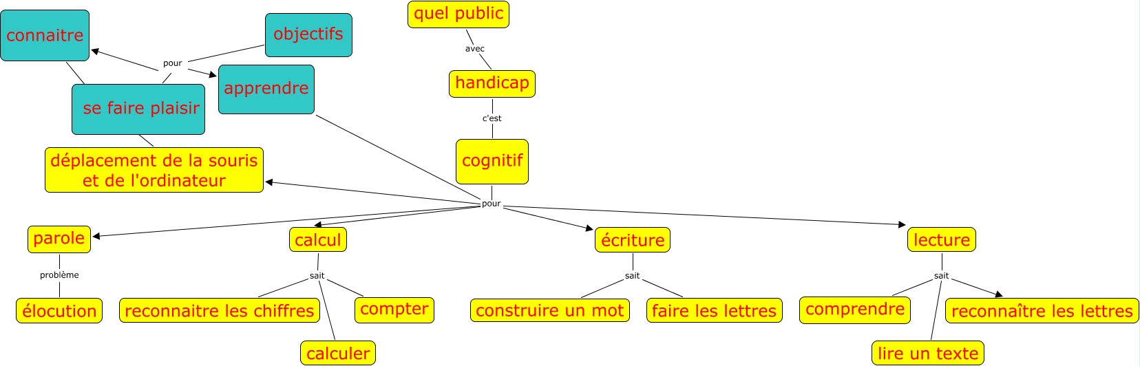 Cette carte de concepts créée avec IHMC CmapTools traite de: publique, objectifs pour connaitre, écriture sait faire les lettres, calcul sait reconnaitre les chiffres, apprendre pour calcul, lecture sait comprendre, connaitre ???? déplacement de la souris et de l'ordinateur, écriture sait construire un mot, lecture sait lire un texte, quel public avec handicap, calcul sait calculer, apprendre pour parole, apprendre pour lecture, cognitif pour déplacement de la souris et de l'ordinateur, lecture sait reconnaître les lettres, apprendre pour déplacement de la souris et de l'ordinateur, objectifs pour apprendre, calcul sait compter, cognitif pour parole, cognitif pour écriture, parole problème élocution