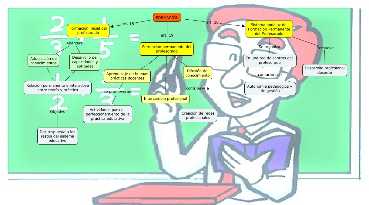 Este Cmap, tiene información relacionada con: FORMACIÓN, Formación inicial del profesorado Abarcará Adquisición de conocimientos, Formación inicial del profesorado Abarcará Desarrollo de capacidades y aptitudes, FORMACIÓN art. 19 Formación permanente del profesorado, FORMACIÓN art. 20 Sistema andaluz de Formación Permanente del Profesorado, Sistema andaluz de Formación Permanente del Profesorado Promueve Desarrollo profesional docente, Sistema andaluz de Formación Permanente del Profesorado Se organiza En una red de centros del profesorado, Difusión del conocimiento contribuye a Creación de redes profesionales, Formación permanente del profesorado Difusión del conocimiento, Adquisición de conocimientos Relación permanente e interactiva entre teoría y práctica, Aprendizaje de buenas prácticas docentes se promoverán Actividades para el perfeccionamiento de la práctica educativa, Desarrollo de capacidades y aptitudes Relación permanente e interactiva entre teoría y práctica, Formación permanente del profesorado Aprendizaje de buenas prácticas docentes, En una red de centros del profesorado contarán con Autonomía pedagógica y de gestión, FORMACIÓN art. 18 Formación inicial del profesorado, Relación permanente e interactiva entre teoría y práctica Objetivo Dar respuesta a los restos del sistema educativo, Formación permanente del profesorado Intercambio profesional