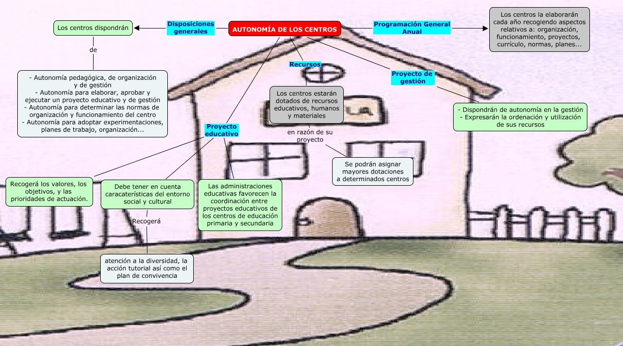 Este Cmap, tiene información relacionada con: AUTONOMIA DE LOS CENTROS, AUTONOMÍA DE LOS CENTROS Proyecto educativo Debe tener en cuenta caracaterísticas del entorno social y cultural, Los centros dispondrán de - Autonomía pedagógica, de organización y de gestión - Autonomía para elaborar, aprobar y ejecutar un proyecto educativo y de gestión - Autonomía para determinar las normas de organización y funcionamiento del centro - Autonomía para adoptar experimentaciones, planes de trabajo, organización..., AUTONOMÍA DE LOS CENTROS Recursos Los centros estarán dotados de recursos educativos, humanos y materiales, AUTONOMÍA DE LOS CENTROS Proyecto de gestión - Dispondrán de autonomía en la gestión - Expresarán la ordenación y utilización de sus recursos, AUTONOMÍA DE LOS CENTROS Proyecto educativo Las administraciones educativas favorecen la coordinación entre proyectos educativos de los centros de educación primaria y secundaria, AUTONOMÍA DE LOS CENTROS Programación General Anual Los centros la elaborarán cada año recogiendo aspectos relativos a: organización, funcionamiento, proyectos, currículo, normas, planes..., Debe tener en cuenta caracaterísticas del entorno social y cultural Recogerá atención a la diversidad, la acción tutorial así como el plan de convivencia, Los centros estarán dotados de recursos educativos, humanos y materiales en razón de su proyecto Se podrán asignar mayores dotaciones a determinados centros, AUTONOMÍA DE LOS CENTROS Disposiciones generales Los centros dispondrán, AUTONOMÍA DE LOS CENTROS Proyecto educativo Recogerá los valores, los objetivos, y las prioridades de actuación.