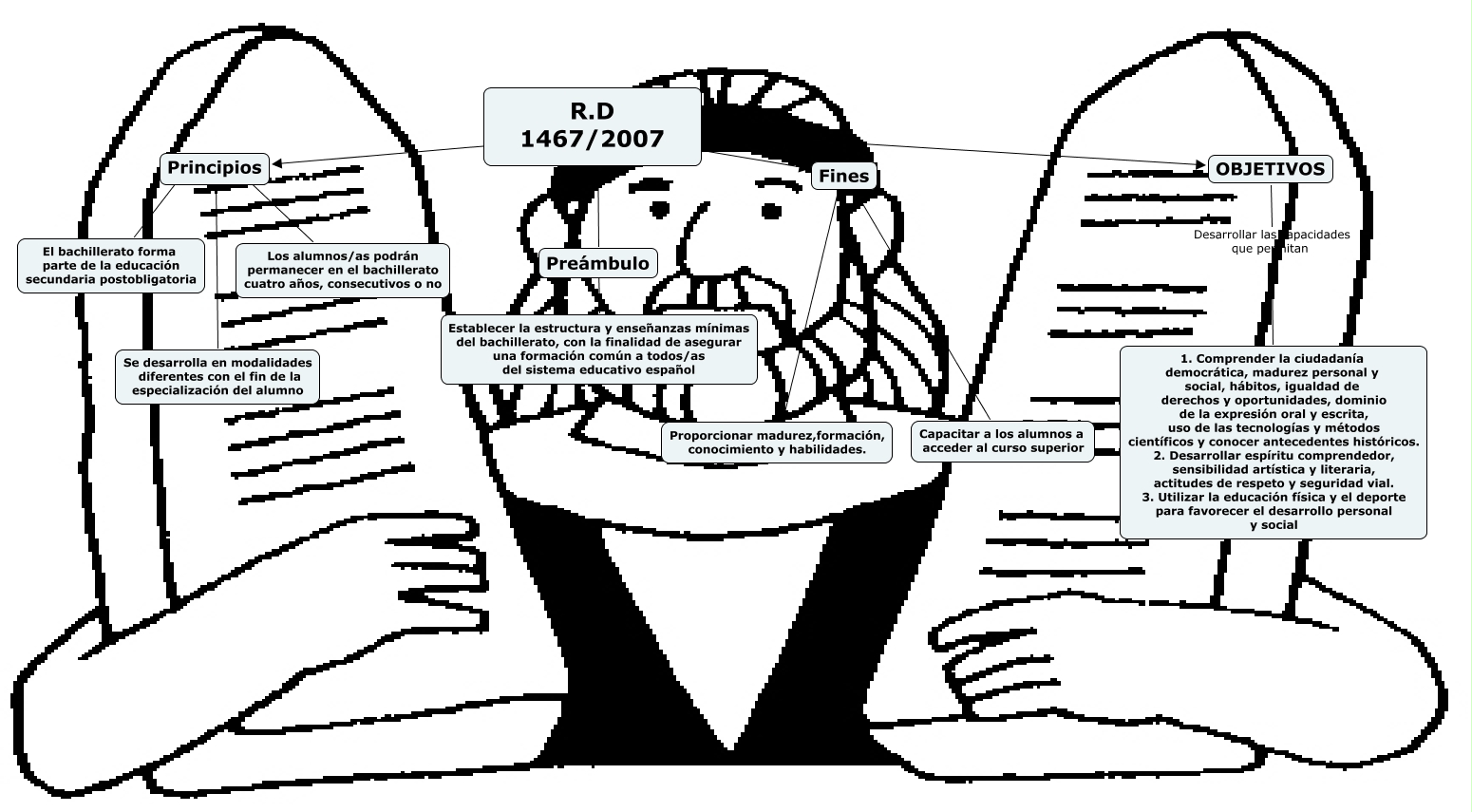 Este Cmap, tiene información relacionada con: CMAP3, Principios ???? Los alumnos/as podrán permanecer en el bachillerato cuatro años, consecutivos o no, Principios ???? El bachillerato forma parte de la educación secundaria postobligatoria, Fines ???? Proporcionar madurez,formación, conocimiento y habilidades., R.D 1467/2007 ???? Fines, OBJETIVOS Desarrollar las capacidades que permitan 1. Comprender la ciudadanía democrática, madurez personal y social, hábitos, igualdad de derechos y oportunidades, dominio de la expresión oral y escrita, uso de las tecnologías y métodos científicos y conocer antecedentes históricos. 2. Desarrollar espíritu comprendedor, sensibilidad artística y literaria, actitudes de respeto y seguridad vial. 3. Utilizar la educación física y el deporte para favorecer el desarrollo personal y social, R.D 1467/2007 ???? OBJETIVOS, Fines ???? Capacitar a los alumnos a acceder al curso superior, R.D 1467/2007 ???? Principios, Principios ???? Se desarrolla en modalidades diferentes con el fin de la especialización del alumno, R.D 1467/2007 ???? Preámbulo, Preámbulo ???? Establecer la estructura y enseñanzas mínimas del bachillerato, con la finalidad de asegurar una formación común a todos/as del sistema educativo español