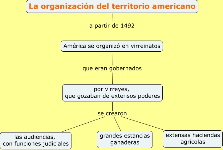Este Cmap, tiene información relacionada con: La organización del territorio americano, por virreyes, que gozaban de extensos poderes se crearon extensas haciendas agrícolas, por virreyes, que gozaban de extensos poderes se crearon grandes estancias ganaderas, La organización del territorio americano a partir de 1492 América se organizó en virreinatos, por virreyes, que gozaban de extensos poderes se crearon las audiencias, con funciones judiciales, América se organizó en virreinatos que eran gobernados por virreyes, que gozaban de extensos poderes