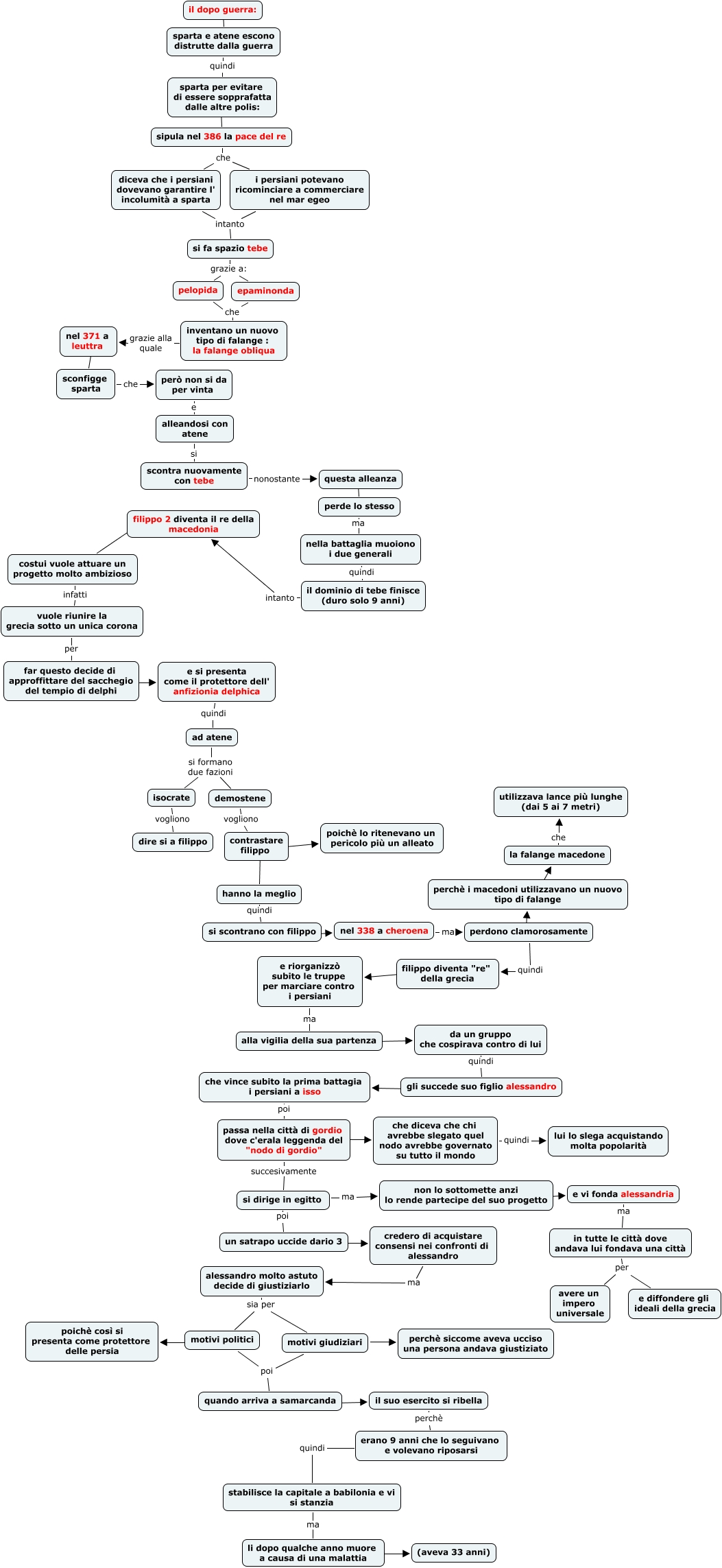 Questa Cmap, creata con IHMC CmapTools, contiene informazioni relative a: il dopo guerra (tebe e macedonia), alla vigilia della sua partenza ???? da un gruppo che cospirava contro di lui, si dirige in egitto ma non lo sottomette anzi lo rende partecipe del suo progetto, far questo decide di approffittare del sacchegio del tempio di delphi ???? e si presenta come il protettore dell' anfizionia delphica, il suo esercito si ribella perchè erano 9 anni che lo seguivano e volevano riposarsi, e riorganizzò subito le truppe per marciare contro i persiani ma alla vigilia della sua partenza, costui vuole attuare un progetto molto ambizioso infatti vuole riunire la grecia sotto un unica corona, da un gruppo che cospirava contro di lui quindi gli succede suo figlio alessandro, nella battaglia muoiono i due generali quindi il dominio di tebe finisce (duro solo 9 anni), ad atene si formano due fazioni isocrate, sparta per evitare di essere sopprafatta dalle altre polis: ???? sipula nel 386 la pace del re, motivi giudiziari poi quando arriva a samarcanda, si dirige in egitto poi un satrapo uccide dario 3, questa alleanza ???? perde lo stesso, isocrate vogliono dire si a filippo, nel 371 a leuttra ???? sconfigge sparta, gli succede suo figlio alessandro ???? che vince subito la prima battagia i persiani a isso, i persiani potevano ricominciare a commerciare nel mar egeo intanto si fa spazio tebe, il dominio di tebe finisce (duro solo 9 anni) intanto filippo 2 diventa il re della macedonia, che diceva che chi avrebbe slegato quel nodo avrebbe governato su tutto il mondo quindi lui lo slega acquistando molta popolarità, epaminonda che inventano un nuovo tipo di falange : la falange obliqua