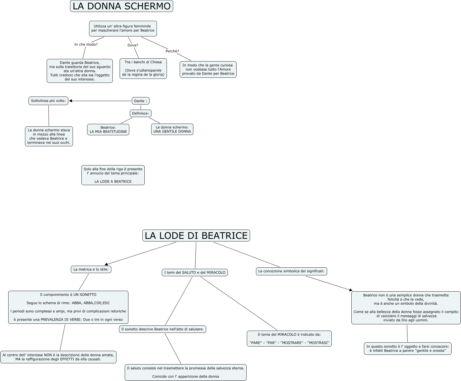 Questa Cmap, creata con IHMC CmapTools, contiene informazioni relative a: Donna Schermo-lode beatrice Giulia Rota .cmap, La concezione simbolica dei significati: Beatrice non è una semplice donna che trasmette felicità a che la vede, ma è anche un simbolo della divinità. Come se alla bellezza della donna fosse assegnato il compito di veicolare il messaggi di salvezza inviato da Dio agli uomini., Utilizza un' altra figura femminile per mascherare l'amore per Beatrice Dove? Tra i banchi di Chiesa (Dove s'udianoparole de la regina de la gloria), LA LODE DI BEATRICE La metrica e lo stile:, Utilizza un' altra figura femminile per mascherare l'amore per Beatrice In che modo? Dante guarda Beatrice, ma sulla traiettoria del suo sguardo sta un'altra donna. Tutti credono che ella sia l'oggetto del suo interesse., LA LODE DI BEATRICE La concezione simbolica dei significati:, Dante : Definisce:, Definisce: La donna schermo: UNA GENTILE DONNA, I temi del SALUTO e del MIRACOLO Il sonetto descrive Beatrice nell'atto di salutare., Utilizza un' altra figura femminile per mascherare l'amore per Beatrice Perchè? In modo che la gente curiosa non vedesse tutto l'Amore provato da Dante per Beatrice, Il componimento è UN SONETTO Segue lo schema di rime: ABBA, ABBA,CDE,EDC l periodi sono complessi e ampi, ma privi di complicazioni retoriche è presente una PREVALENZA DI VERBI: Due o tre in ogni verso Al centro dell' interesse NON è la descrizione della donna amata, MA la raffigurazione degli EFFETTI da ella causati., Dante : Sottolinea più volte:, Definisce: Beatrice: LA MIA BEATITUDINE, I temi del SALUTO e del MIRACOLO Il tema del MIRACOLO è indicato da: ''PARE'' - ''PAR'' - ''MOSTRARE'' - ''MOSTRASI'', Sottolinea più volte: La donna schermo stava in mezzo alla linea che vedeva Beatrice e terminava nei suoi occhi., Il sonetto descrive Beatrice nell'atto di salutare. Il saluto consiste nel trasmettere la promessa della salvezza eterna. Coincide con l' apparizione della donna, Beatrice non è una semplice donna che trasmette felicità a che la vede, ma è anche un simbolo della divinità. Come se alla bellezza della donna fosse assegnato il compito di veicolare il messaggi di salvezza inviato da Dio agli uomini. In questo sonetto è l' oggetto a farsi conoscere: è infatti Beatrice a parere ''gentile e onesta'', LA LODE DI BEATRICE I temi del SALUTO e del MIRACOLO, La metrica e lo stile: Il componimento è UN SONETTO Segue lo schema di rime: ABBA, ABBA,CDE,EDC l periodi sono complessi e ampi, ma privi di complicazioni retoriche è presente una PREVALENZA DI VERBI: Due o tre in ogni verso