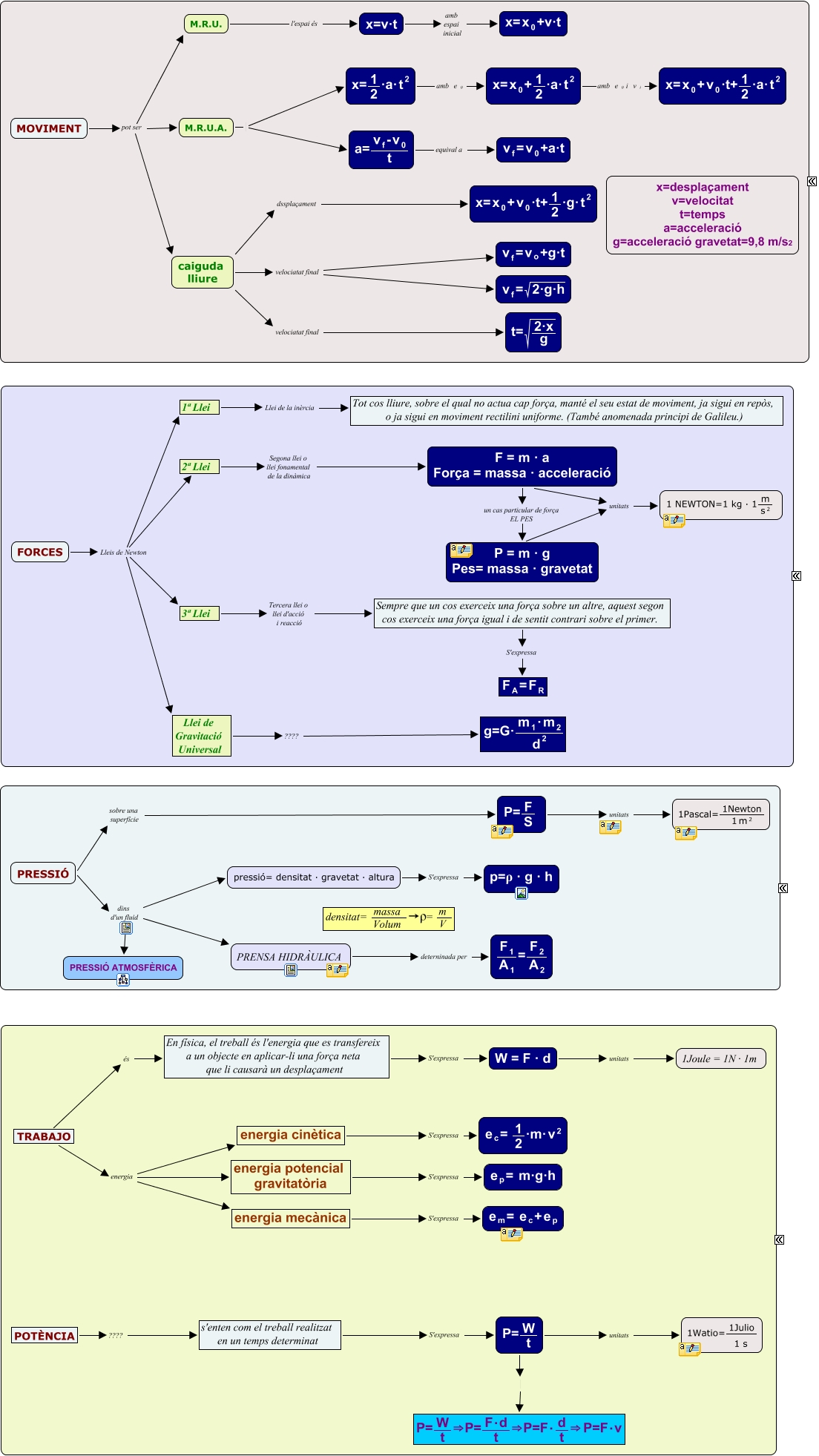 Este Cmap, tiene información relacionada con: FORMULES FISICA, pressió= densitat · gravetat · altura S'expressa p=ρ · g · h, M.R.U.A. <math xmlns="http://www.w3.org/1998/Math/MathML"> <mrow> <mtext> x= </mtext> <mfrac> <mtext> 1 </mtext> <mtext> 2 </mtext> </mfrac> <mtext> ·a· </mtext> <mmultiscripts> <mtext> t </mtext> <none/> <mtext> 2 </mtext> </mmultiscripts> </mrow> </math>, <math xmlns="http://www.w3.org/1998/Math/MathML"> <mrow> <mtext> x= </mtext> <mmultiscripts> <mtext> x </mtext> <mtext> 0 </mtext> <none/> </mmultiscripts> <mtext> + </mtext> <mfrac> <mtext> 1 </mtext> <mtext> 2 </mtext> </mfrac> <mtext> ·a· </mtext> <mmultiscripts> <mtext> t </mtext> <none/> <mtext> 2 </mtext> </mmultiscripts> </mrow> </math> <math xmlns="http://www.w3.org/1998/Math/MathML"> <mrow> <mtext> amb </mtext> <mmultiscripts> <mtext> e </mtext> <mtext> 0 </mtext> <none/> </mmultiscripts> <mtext> i </mtext> <mmultiscripts> <mtext> v </mtext> <mtext> i </mtext> <none/> </mmultiscripts> </mrow> </math> <math xmlns="http://www.w3.org/1998/Math/MathML"> <mrow> <mtext> x= </mtext> <mmultiscripts> <mtext> x </mtext> <mtext> 0 </mtext> <none/> </mmultiscripts> <mtext> + </mtext> <mmultiscripts> <mtext> v </mtext> <mtext> 0 </mtext> <none/> </mmultiscripts> <mtext> ·t+ </mtext> <mfrac> <mtext> 1 </mtext> <mtext> 2 </mtext> </mfrac> <mtext> ·a· </mtext> <mmultiscripts> <mtext> t </mtext> <none/> <mtext> 2 </mtext> </mmultiscripts> </mrow> </math>, FORCES Lleis de Newton 1ª Llei, PRENSA HIDRÀULICA deterninada per <math xmlns="http://www.w3.org/1998/Math/MathML"> <mrow> <mfrac> <mmultiscripts> <mtext> F </mtext> <mtext> 1 </mtext> <none/> </mmultiscripts> <mmultiscripts> <mtext> A </mtext> <mtext> 1 </mtext> <none/> </mmultiscripts> </mfrac> <mtext> = </mtext> <mfrac> <mmultiscripts> <mtext> F </mtext> <mtext> 2 </mtext> <none/> </mmultiscripts> <mrow> <mmultiscripts> <mtext> A </mtext> <mtext> 2 </mtext> <none/> </mmultiscripts> </mrow> </mfrac> </mrow> </math>, F = m · a Força = massa · acceleració unitats <math xmlns="http://www.w3.org/1998/Math/MathML"> <mrow> <mtext> 1 NEWTON=1 kg · 1 </mtext> <mfrac> <mtext> m </mtext> <mmultiscripts> <mtext> s </mtext> <none/> <mtext> 2 </mtext> </mmultiscripts> </mfrac> <mtext> </mtext> </mrow> </math>, TRABAJO energia energia cinètica, PRESSIÓ dins d'un fluid pressió= densitat · gravetat · altura, PRESSIÓ dins d'un fluid PRENSA HIDRÀULICA, <math xmlns="http://www.w3.org/1998/Math/MathML"> <mrow> <mtext> P= </mtext> <mfrac> <mtext> W </mtext> <mtext> t </mtext> </mfrac> </mrow> </math> <math xmlns="http://www.w3.org/1998/Math/MathML"> <mrow> <mtext> P= </mtext> <mfrac> <mtext> W </mtext> <mtext> t </mtext> </mfrac> <mtext> ⇒P= </mtext> <mfrac> <mtext> F⋅d </mtext> <mtext> t </mtext> </mfrac> <mrow> <mtext> ⇒P=F⋅ </mtext> <mfrac> <mtext> d </mtext> <mtext> t </mtext> </mfrac> <mtext> ⇒ </mtext> <mrow> <mtext> P=F⋅v </mtext> </mrow> </mrow> </mrow> </math>, PRESSIÓ dins d'un fluid PRESSIÓ ATMOSFÈRICA, energia cinètica S'expressa <math xmlns="http://www.w3.org/1998/Math/MathML"> <mrow> <mmultiscripts> <mtext> e </mtext> <mtext> c </mtext> <none/> </mmultiscripts> <mtext> = </mtext> <mfrac> <mtext> 1 </mtext> <mtext> 2 </mtext> </mfrac> <mtext> ·m· </mtext> <mmultiscripts> <mtext> v </mtext> <none/> <mtext> 2 </mtext> </mmultiscripts> </mrow> </math>, W = F · d unitats 1Joule = 1N · 1m, Llei de Gravitació Universal ???? <math xmlns="http://www.w3.org/1998/Math/MathML"> <mrow> <mtext> g=G· </mtext> <mfrac> <mrow> <mmultiscripts> <mtext> m </mtext> <mtext> 1 </mtext> <none/> </mmultiscripts> <mtext> · </mtext> <mmultiscripts> <mtext> m </mtext> <mtext> 2 </mtext> <none/> </mmultiscripts> </mrow> <mmultiscripts> <mtext> d </mtext> <none/> <mtext> 2 </mtext> </mmultiscripts> </mfrac> </mrow> </math>, PRESSIÓ sobre una superfície <math xmlns="http://www.w3.org/1998/Math/MathML"> <mrow> <mtext> P= </mtext> <mfrac> <mtext> F </mtext> <mtext> S </mtext> </mfrac> <mtext> </mtext> </mrow> </math>, M.R.U.A. <math xmlns="http://www.w3.org/1998/Math/MathML"> <mrow> <mtext> a= </mtext> <mfrac> <mrow> <mmultiscripts> <mtext> v </mtext> <mtext> f </mtext> <none/> </mmultiscripts> <mtext> - </mtext> <mmultiscripts> <mtext> v </mtext> <mtext> 0 </mtext> <none/> </mmultiscripts> </mrow> <mtext> t </mtext> </mfrac> </mrow> </math>, FORCES Lleis de Newton 2ª Llei, TRABAJO és En física, el treball és l'energia que es transfereix a un objecte en aplicar-li una força neta que li causarà un desplaçament, 2ª Llei Segona llei o llei fonamental de la dinàmica F = m · a Força = massa · acceleració, <math xmlns="http://www.w3.org/1998/Math/MathML"> <mrow> <mtext> x= </mtext> <mfrac> <mtext> 1 </mtext> <mtext> 2 </mtext> </mfrac> <mtext> ·a· </mtext> <mmultiscripts> <mtext> t </mtext> <none/> <mtext> 2 </mtext> </mmultiscripts> </mrow> </math> <math xmlns="http://www.w3.org/1998/Math/MathML"> <mrow> <mtext> amb </mtext> <mmultiscripts> <mtext> e </mtext> <mtext> 0 </mtext> <none/> </mmultiscripts> </mrow> </math> <math xmlns="http://www.w3.org/1998/Math/MathML"> <mrow> <mtext> x= </mtext> <mmultiscripts> <mtext> x </mtext> <mtext> 0 </mtext> <none/> </mmultiscripts> <mtext> + </mtext> <mfrac> <mtext> 1 </mtext> <mtext> 2 </mtext> </mfrac> <mtext> ·a· </mtext> <mmultiscripts> <mtext> t </mtext> <none/> <mtext> 2 </mtext> </mmultiscripts> </mrow> </math>