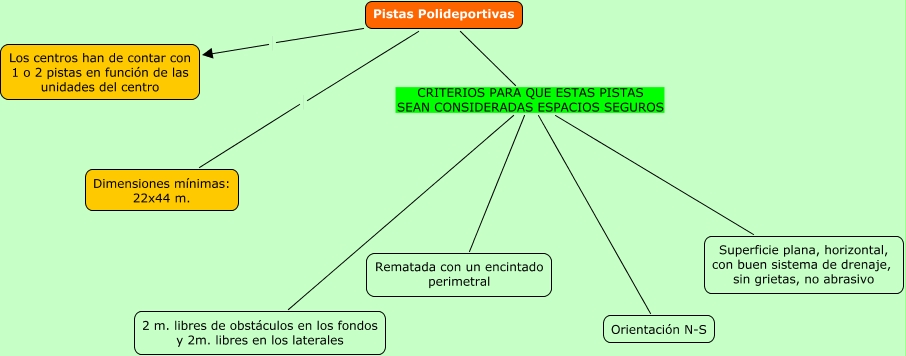 Este Cmap, tiene información relacionada con: pistas polideportivas, Pistas Polideportivas CRITERIOS PARA QUE ESTAS PISTAS SEAN CONSIDERADAS ESPACIOS SEGUROS Orientación N-S, Pistas Polideportivas Los centros han de contar con 1 o 2 pistas en función de las unidades del centro, Pistas Polideportivas CRITERIOS PARA QUE ESTAS PISTAS SEAN CONSIDERADAS ESPACIOS SEGUROS 2 m. libres de obstáculos en los fondos y 2m. libres en los laterales, Pistas Polideportivas CRITERIOS PARA QUE ESTAS PISTAS SEAN CONSIDERADAS ESPACIOS SEGUROS Rematada con un encintado perimetral, Pistas Polideportivas CRITERIOS PARA QUE ESTAS PISTAS SEAN CONSIDERADAS ESPACIOS SEGUROS Superficie plana, horizontal, con buen sistema de drenaje, sin grietas, no abrasivo, Pistas Polideportivas Dimensiones mínimas: 22x44 m.