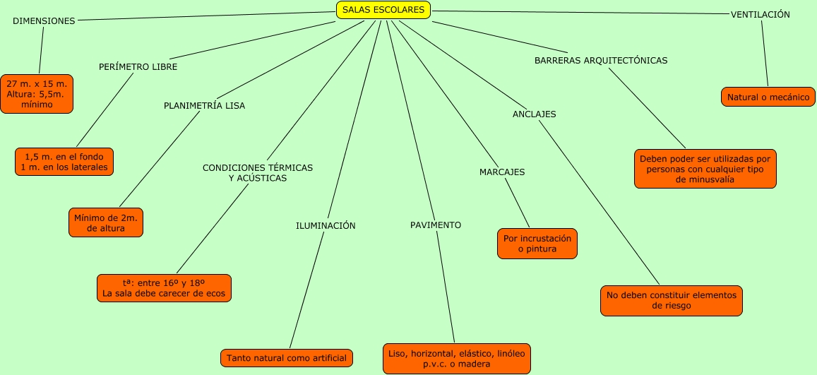 Este Cmap, tiene información relacionada con: salas escolares, SALAS ESCOLARES PLANIMETRÍA LISA Mínimo de 2m. de altura, SALAS ESCOLARES CONDICIONES TÉRMICAS Y ACÚSTICAS tª: entre 16º y 18º La sala debe carecer de ecos, SALAS ESCOLARES ANCLAJES No deben constituir elementos de riesgo, SALAS ESCOLARES MARCAJES Por incrustación o pintura, SALAS ESCOLARES DIMENSIONES 27 m. x 15 m. Altura: 5,5m. mínimo, SALAS ESCOLARES VENTILACIÓN Natural o mecánico, SALAS ESCOLARES ILUMINACIÓN Tanto natural como artificial, SALAS ESCOLARES BARRERAS ARQUITECTÓNICAS Deben poder ser utilizadas por personas con cualquier tipo de minusvalía, SALAS ESCOLARES PAVIMENTO Liso, horizontal, elástico, linóleo p.v.c. o madera, SALAS ESCOLARES PERÍMETRO LIBRE 1,5 m. en el fondo 1 m. en los laterales