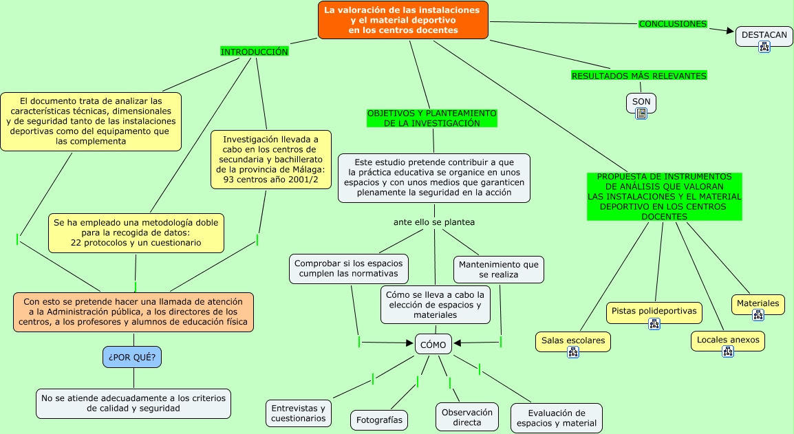 Este Cmap, tiene información relacionada con: Mapa resumen articulo, La valoración de las instalaciones y el material deportivo en los centros docentes INTRODUCCIÓN El documento trata de analizar las características técnicas, dimensionales y de seguridad tanto de las instalaciones deportivas como del equipamento que las complementa, CÓMO Entrevistas y cuestionarios, La valoración de las instalaciones y el material deportivo en los centros docentes PROPUESTA DE INSTRUMENTOS DE ANÁLISIS QUE VALORAN LAS INSTALACIONES Y EL MATERIAL DEPORTIVO EN LOS CENTROS DOCENTES Salas escolares, CÓMO Fotografías, Investigación llevada a cabo en los centros de secundaria y bachillerato de la provincia de Málaga: 93 centros año 2001/2 Con esto se pretende hacer una llamada de atención a la Administración pública, a los directores de los centros, a los profesores y alumnos de educación física, Cómo se lleva a cabo la elección de espacios y materiales CÓMO, Este estudio pretende contribuir a que la práctica educativa se organice en unos espacios y con unos medios que garanticen plenamente la seguridad en la acción ante ello se plantea Mantenimiento que se realiza, La valoración de las instalaciones y el material deportivo en los centros docentes PROPUESTA DE INSTRUMENTOS DE ANÁLISIS QUE VALORAN LAS INSTALACIONES Y EL MATERIAL DEPORTIVO EN LOS CENTROS DOCENTES Materiales, La valoración de las instalaciones y el material deportivo en los centros docentes INTRODUCCIÓN Investigación llevada a cabo en los centros de secundaria y bachillerato de la provincia de Málaga: 93 centros año 2001/2, La valoración de las instalaciones y el material deportivo en los centros docentes PROPUESTA DE INSTRUMENTOS DE ANÁLISIS QUE VALORAN LAS INSTALACIONES Y EL MATERIAL DEPORTIVO EN LOS CENTROS DOCENTES Locales anexos, Con esto se pretende hacer una llamada de atención a la Administración pública, a los directores de los centros, a los profesores y alumnos de educación física No se atiende adecuadamente a los criterios de calidad y seguridad, La valoración de las instalaciones y el material deportivo en los centros docentes CONCLUSIONES DESTACAN, Este estudio pretende contribuir a que la práctica educativa se organice en unos espacios y con unos medios que garanticen plenamente la seguridad en la acción ante ello se plantea Comprobar si los espacios cumplen las normativas, Este estudio pretende contribuir a que la práctica educativa se organice en unos espacios y con unos medios que garanticen plenamente la seguridad en la acción ante ello se plantea Cómo se lleva a cabo la elección de espacios y materiales, La valoración de las instalaciones y el material deportivo en los centros docentes RESULTADOS MÁS RELEVANTES SON, CÓMO Observación directa, El documento trata de analizar las características técnicas, dimensionales y de seguridad tanto de las instalaciones deportivas como del equipamento que las complementa Con esto se pretende hacer una llamada de atención a la Administración pública, a los directores de los centros, a los profesores y alumnos de educación física, La valoración de las instalaciones y el material deportivo en los centros docentes INTRODUCCIÓN Se ha empleado una metodología doble para la recogida de datos: 22 protocolos y un cuestionario, Comprobar si los espacios cumplen las normativas CÓMO, Se ha empleado una metodología doble para la recogida de datos: 22 protocolos y un cuestionario Con esto se pretende hacer una llamada de atención a la Administración pública, a los directores de los centros, a los profesores y alumnos de educación física