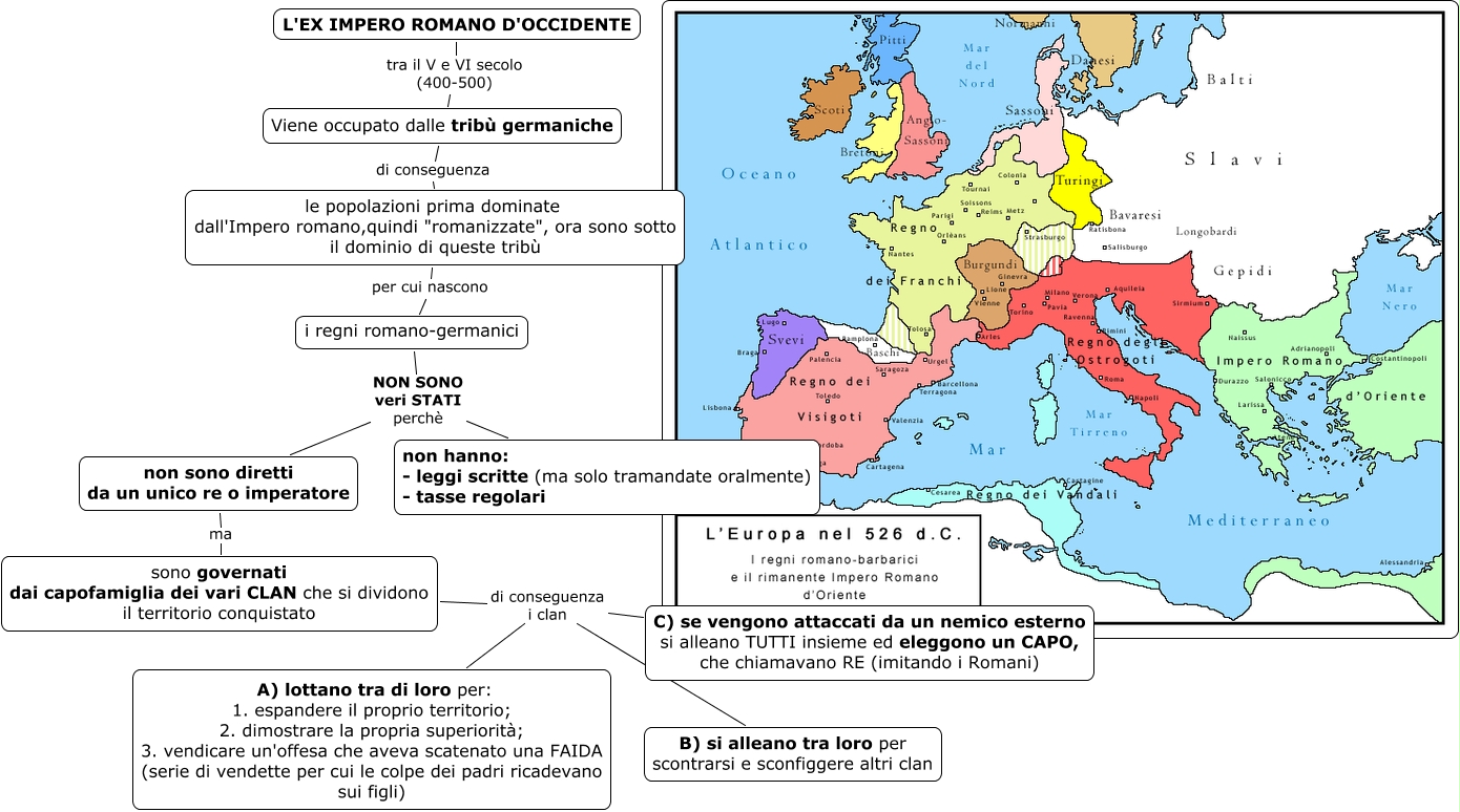 Questa Cmap, creata con IHMC CmapTools, contiene informazioni relative a: 08.regni romano-germanici, le popolazioni prima dominate dall'Impero romano,quindi "romanizzate", ora sono sotto il dominio di queste tribù per cui nascono i regni romano-germanici, L'EX IMPERO ROMANO D'OCCIDENTE tra il V e VI secolo (400-500) Viene occupato dalle tribù germaniche, non sono diretti da un unico re o imperatore ma sono governati dai capofamiglia dei vari CLAN che si dividono il territorio conquistato, Viene occupato dalle tribù germaniche di conseguenza le popolazioni prima dominate dall'Impero romano,quindi "romanizzate", ora sono sotto il dominio di queste tribù, i regni romano-germanici NON SONO veri STATI perchè non sono diretti da un unico re o imperatore, sono governati dai capofamiglia dei vari CLAN che si dividono il territorio conquistato di conseguenza i clan A) lottano tra di loro per: 1. espandere il proprio territorio; 2. dimostrare la propria superiorità; 3. vendicare un'offesa che aveva scatenato una FAIDA (serie di vendette per cui le colpe dei padri ricadevano sui figli), sono governati dai capofamiglia dei vari CLAN che si dividono il territorio conquistato di conseguenza i clan C) se vengono attaccati da un nemico esterno si alleano TUTTI insieme ed eleggono un CAPO, che chiamavano RE (imitando i Romani), i regni romano-germanici NON SONO veri STATI perchè non hanno: - leggi scritte (ma solo tramandate oralmente) - tasse regolari, sono governati dai capofamiglia dei vari CLAN che si dividono il territorio conquistato di conseguenza i clan B) si alleano tra loro per scontrarsi e sconfiggere altri clan