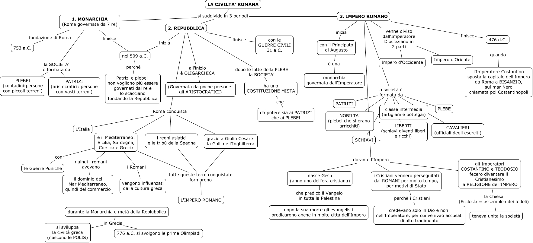 Questa Cmap, creata con IHMC CmapTools, contiene informazioni relative a: 05.civiltà romana, 2. REPUBBLICA finisce con le GUERRE CIVILI 31 a.C., ha una COSTITUZIONE MISTA che dà potere sia ai PATRIZI che ai PLEBEI, 3. IMPERO ROMANO la società è formata da SCHIAVI, 3. IMPERO ROMANO inizia con il Principato di Augusto, 2. REPUBBLICA dopo le lotte della PLEBE la SOCIETA' ha una COSTITUZIONE MISTA, 3. IMPERO ROMANO durante l'Impero gli Imperatori COSTANTINO e TEODOSIO fecero diventare il Cristianesimo la RELIGIONE dell'IMPERO, 3. IMPERO ROMANO finisce 476 d.C., 1. MONARCHIA (Roma governata da 7 re) finisce nel 509 a.C., 3. IMPERO ROMANO durante l'Impero nasce Gesù (anno uno dell'era cristiana), con il Principato di Augusto è una monarchia governata dall'Imperatore, 1. MONARCHIA (Roma governata da 7 re) la SOCIETA' è formata da PLEBEI (contadini:persone con piccoli terreni), 2. REPUBBLICA inizia nel 509 a.C., 3. IMPERO ROMANO la società è formata da CAVALIERI (ufficiali degli eserciti), 3. IMPERO ROMANO la società è formata da classe intermedia (artigiani e bottegai), 3. IMPERO ROMANO durante l'Impero i Cristiani vennero perseguitati dai ROMANI per molto tempo, per motivi di Stato, LA CIVILTA' ROMANA si suddivide in 3 periodi 1. MONARCHIA (Roma governata da 7 re), 3. IMPERO ROMANO la società è formata da LIBERTI (schiavi diventi liberi e ricchi), 1. MONARCHIA (Roma governata da 7 re) la SOCIETA' è formata da PATRIZI (aristocratici: persone con vasti terreni), 3. IMPERO ROMANO venne diviso dall'Imperatore Diocleziano in 2 parti Impero d'Oriente, 3. IMPERO ROMANO la società è formata da PATRIZI
