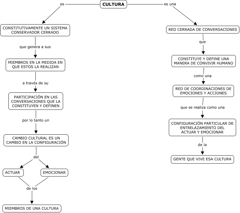 Este Cmap, tiene información relacionada con: Cultura, CULTURA es una RED CERRADA DE CONVERSACIONES, CAMBIO CULTURAL ES UN CAMBIO EN LA CONFIGURACIÓN del EMOCIONAR, CULTURA es CONSTITUTIVAMENTE UN SISTEMA CONSERVADOR CERRADO, EMOCIONAR de los MIEMBROS DE UNA CULTURA, PARTICIPACIÓN EN LAS CONVERSACIONES QUE LA CONSTITUYEN Y DEFINEN por lo tanto un CAMBIO CULTURAL ES UN CAMBIO EN LA CONFIGURACIÓN, ACTUAR de los MIEMBROS DE UNA CULTURA, CONFIGURACIÓN PARTICULAR DE ENTRELAZAMIENTO DEL ACTUAR Y EMOCIONAR de la GENTE QUE VIVE ESA CULTURA, CAMBIO CULTURAL ES UN CAMBIO EN LA CONFIGURACIÓN del ACTUAR, CONSTITUYE Y DEFINE UNA MANERA DE CONVIVIR HUMANO como una RED DE COORDINACIONES DE EMOCIONES Y ACCIONES, CONSTITUTIVAMENTE UN SISTEMA CONSERVADOR CERRADO que genera a sus MIEMBROS EN LA MEDIDA EN QUE ESTOS LA REALIZAN, RED DE COORDINACIONES DE EMOCIONES Y ACCIONES que se realiza como una CONFIGURACIÓN PARTICULAR DE ENTRELAZAMIENTO DEL ACTUAR Y EMOCIONAR, MIEMBROS EN LA MEDIDA EN QUE ESTOS LA REALIZAN a través de su PARTICIPACIÓN EN LAS CONVERSACIONES QUE LA CONSTITUYEN Y DEFINEN, RED CERRADA DE CONVERSACIONES que CONSTITUYE Y DEFINE UNA MANERA DE CONVIVIR HUMANO