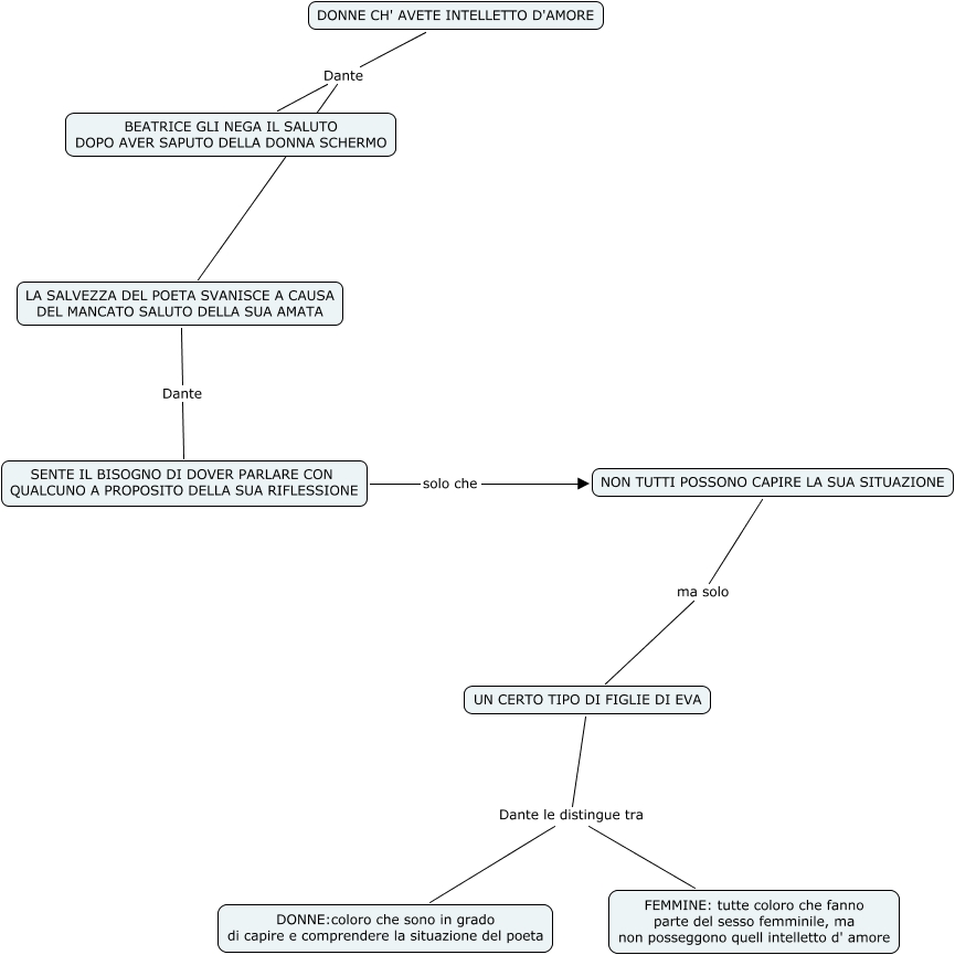 Questa Cmap, creata con IHMC CmapTools, contiene informazioni relative a: VitaNova-DonneChAveteIntellettoD'Amore PaolaG, DONNE CH' AVETE INTELLETTO D'AMORE Dante BEATRICE GLI NEGA IL SALUTO DOPO AVER SAPUTO DELLA DONNA SCHERMO, NON TUTTI POSSONO CAPIRE LA SUA SITUAZIONE ma solo UN CERTO TIPO DI FIGLIE DI EVA, LA SALVEZZA DEL POETA SVANISCE A CAUSA DEL MANCATO SALUTO DELLA SUA AMATA Dante SENTE IL BISOGNO DI DOVER PARLARE CON QUALCUNO A PROPOSITO DELLA SUA RIFLESSIONE, SENTE IL BISOGNO DI DOVER PARLARE CON QUALCUNO A PROPOSITO DELLA SUA RIFLESSIONE solo che NON TUTTI POSSONO CAPIRE LA SUA SITUAZIONE, UN CERTO TIPO DI FIGLIE DI EVA Dante le distingue tra DONNE:coloro che sono in grado di capire e comprendere la situazione del poeta, DONNE CH' AVETE INTELLETTO D'AMORE Dante LA SALVEZZA DEL POETA SVANISCE A CAUSA DEL MANCATO SALUTO DELLA SUA AMATA, UN CERTO TIPO DI FIGLIE DI EVA Dante le distingue tra FEMMINE: tutte coloro che fanno parte del sesso femminile, ma non posseggono quell intelletto d' amore