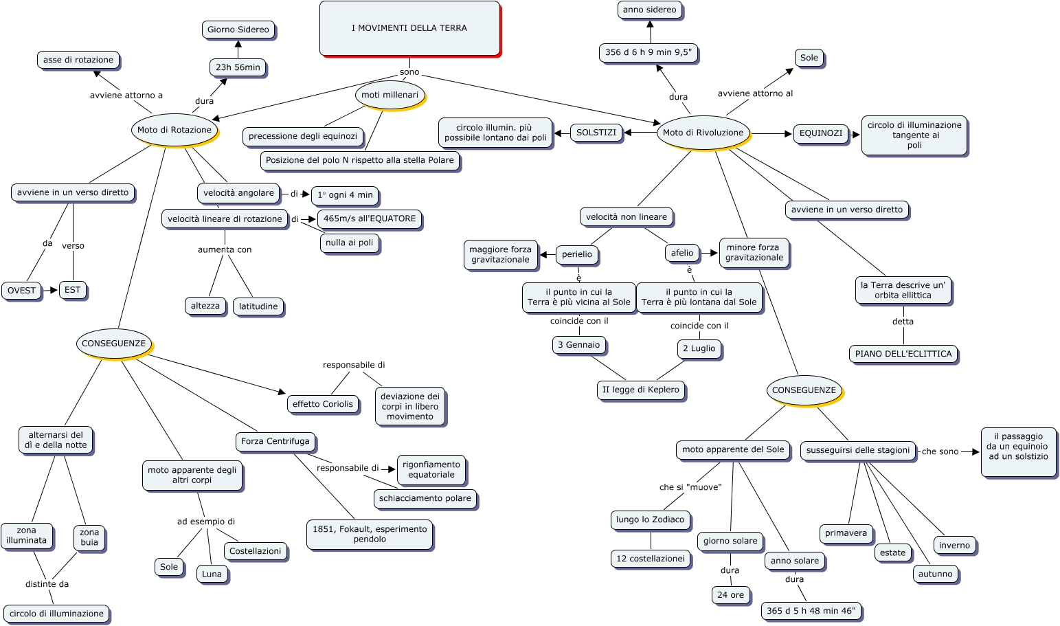 Questa Cmap, creata con IHMC CmapTools, contiene informazioni relative a: I Movimenti della Terra (Sonzogni), susseguirsi delle stagioni ???? primavera, velocità lineare di rotazione aumenta con altezza, il punto in cui la Terra è più vicina al Sole coincide con il 3 Gennaio, perielio ???? maggiore forza gravitazionale, I MOVIMENTI DELLA TERRA sono moti millenari, avviene in un verso diretto da OVEST, susseguirsi delle stagioni ???? inverno, moto apparente del Sole che si "muove" lungo lo Zodiaco, Moto di Rotazione che avviene in un verso diretto, zona buia distinte da circolo di illuminazione, OVEST ???? EST, Moto di Rivoluzione ???? avviene in un verso diretto, alternarsi del dì e della notte ???? zona buia, moti millenari ???? precessione degli equinozi, alternarsi del dì e della notte ???? zona illuminata, CONSEGUENZE ???? alternarsi del dì e della notte, la Terra descrive un' orbita ellittica detta PIANO DELL'ECLITTICA, susseguirsi delle stagioni ???? autunno, I MOVIMENTI DELLA TERRA sono Moto di Rivoluzione, I MOVIMENTI DELLA TERRA sono Moto di Rotazione